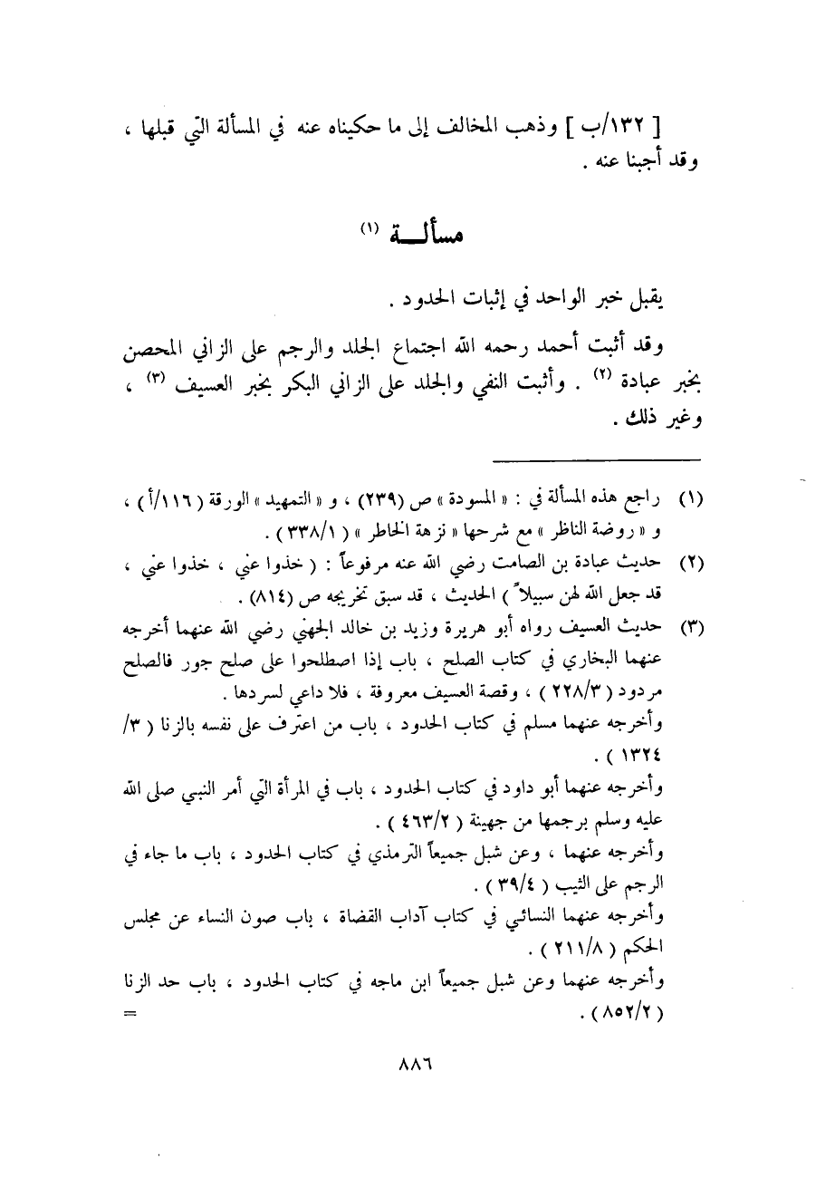 (1) راجع هذه المسألة في: "المسودة" ص (239) ، و"التمهيد" الورقة (116/أ) ، (2) و"روضه الناظر" مع شرحها "نزهة الخاطر" (1/338) .
