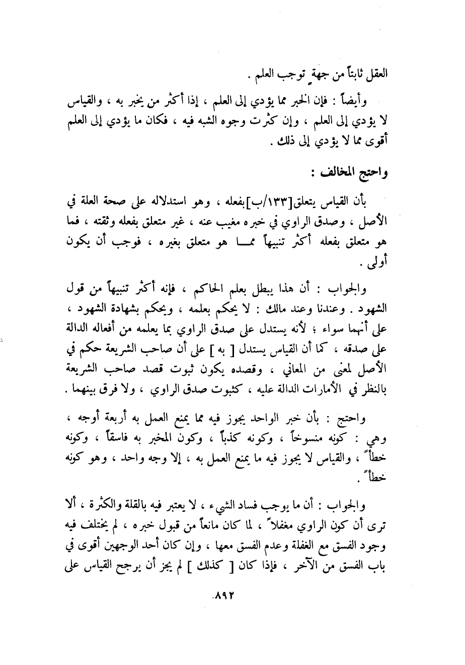 والجواب: أن هذا يبطل بعلم الحاكم، فإنه أكثر تنبيهاً من قول الشهود. وعندنا وعند مالك: لا يحكم بعلمه، ويحكم بشهادة الشهود، على أنهما سواء؛ لأنه يستدل على صدق الراوي بما يعلمه من أفعاله الدالة على صدقه، كما أن القياس يستدل [به] على أن صاحب الشريعة حكم في الأصل لمعنى من المعاني، وقصده يكون ثبوت قصد صاحب الشريعة بالنظر في الأمارات الدالة عليه، كثبوت صدق الراوي، ولا فرق بينهما.