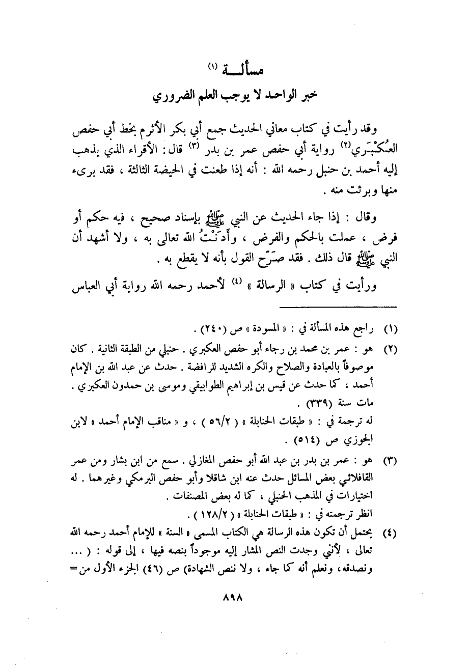 (2) هو: عمر بن محمد بن رجاء أبو حفص العكبري. حنبلي من الطبقة الثانية. كان موصوفاً بالعبادة والصلاح والكره الشديد للرافضة. حدث عن عبد الله بن الإمام أحمد، كما حدث عن قيس بن إبراهيم الطوابيقي وموسى بن حمدون العكبري.
