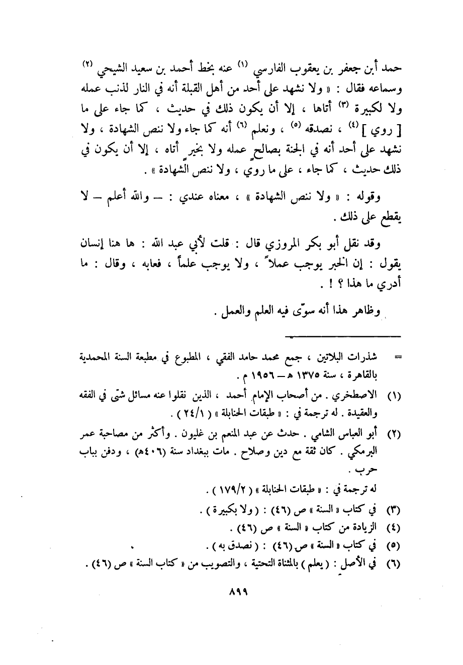 حمد بن جعفر بن يعقوب الفارسي (1) عنه بخط أحمد بن سعيد الشيحي (2) وسماعه فقال: "ولا نشهد على أحد من أهل القبلة أنه في النار لذنب عمله ولا لكبيرة (3) أتاها، إلا أن يكون ذلك في حديث، كما جاء على ما [روي] ، (4) ، نصدقه (5) ، ونعلم (6) أنه كما جاء ولا ننص الشهادة، ولا نشهد على أحد أنه في الجنة بصالح عمله ولا بخير أتاه، إلا أن يكون في ذلك حديث، كما جاء، على ما روي، ولاننص الشهادة".