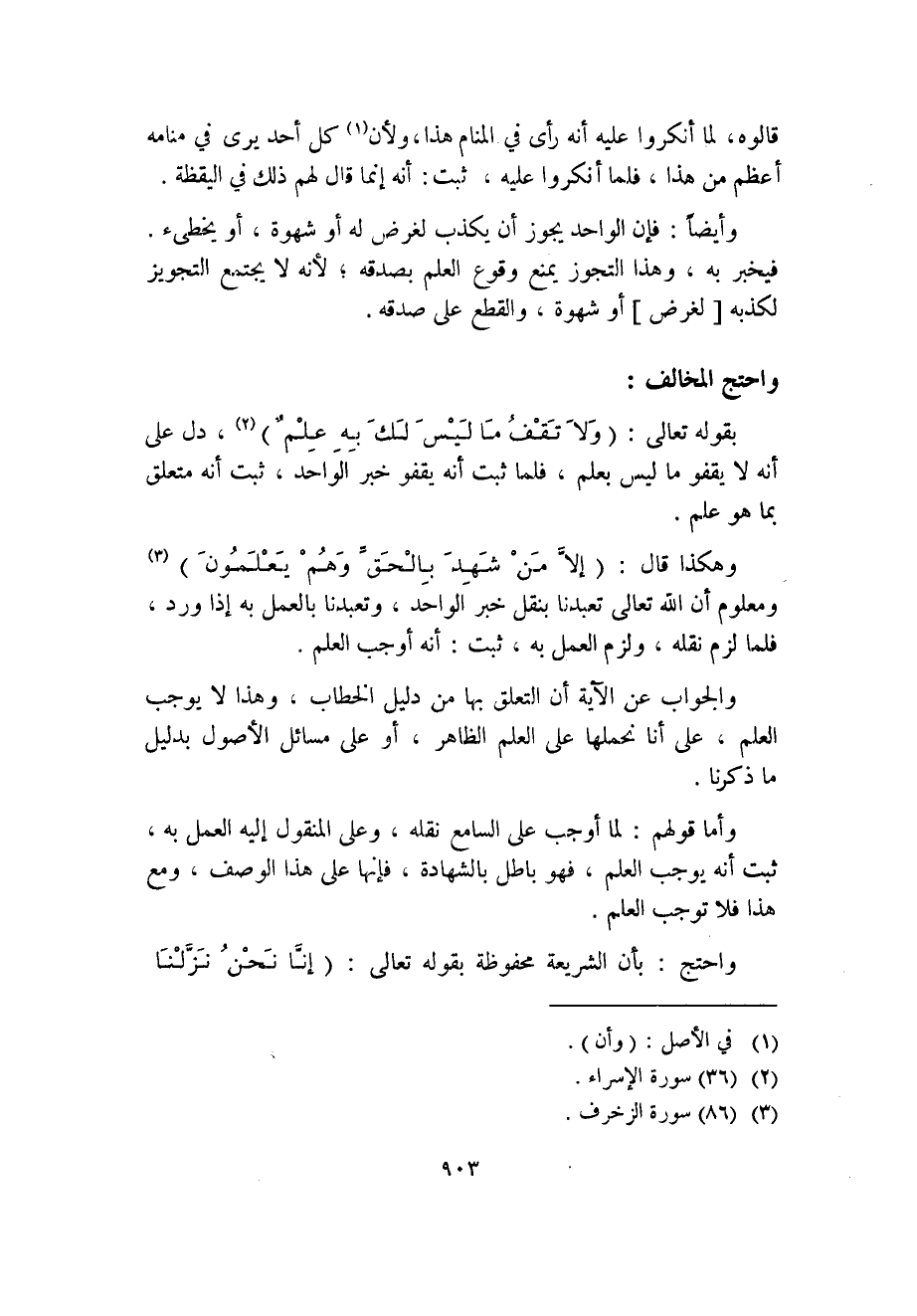 وهكذا قال: (إلا منْ شَهِدَ بالْحَقِّ وَهُمْ يَعْلَمُونَ) (3) ومعلوم أن الله تعالى تعبدنا بنقل خبر الواحد، وتعبدنا بالعمل به إذا ورد، فلما لزم نقله، ولزم العمل به، ثبت: أنه أوجب العلم.