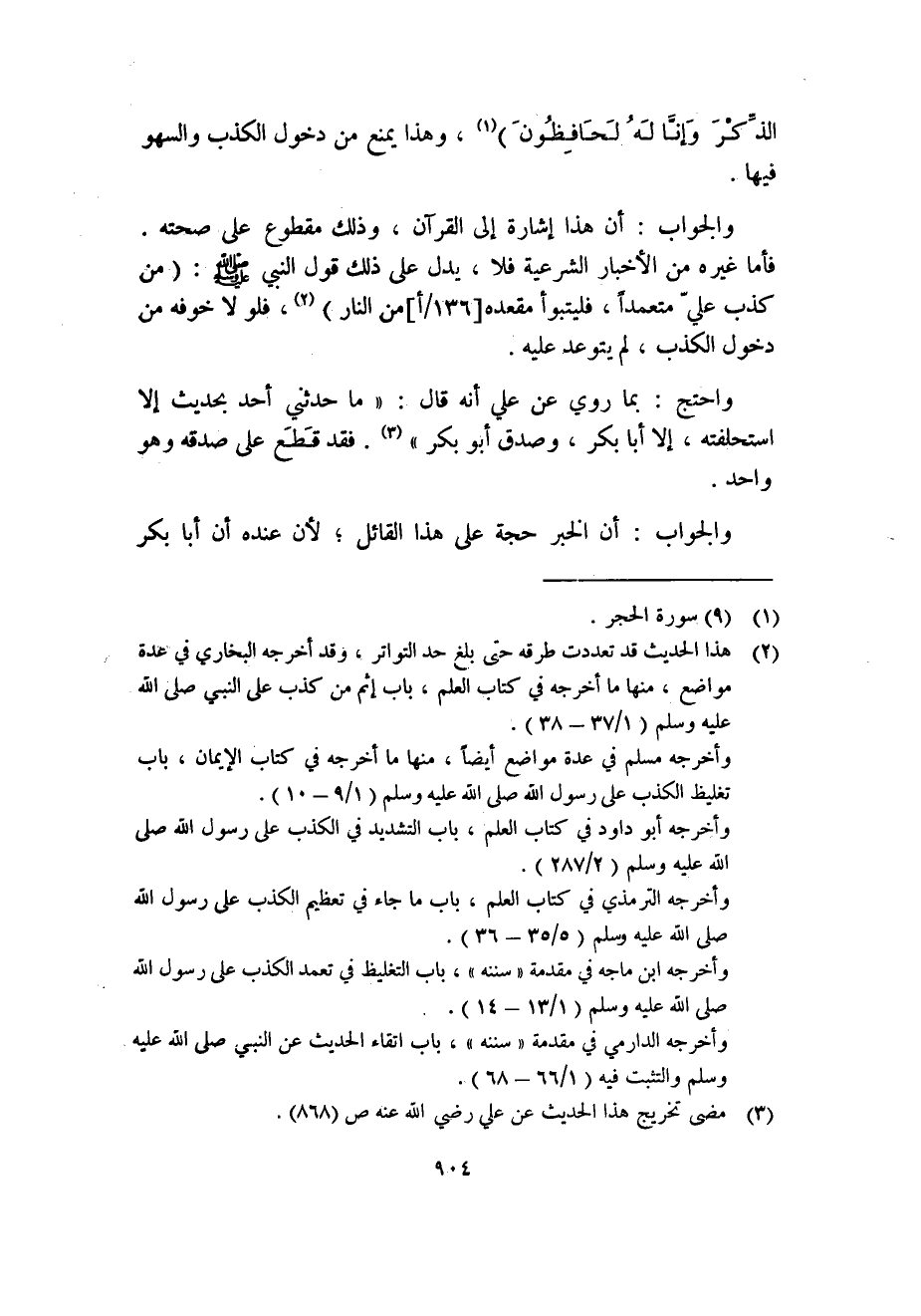 والجواب: أن الخبر حجة على هذا القائل؛ لأن عنده أن أبا بكر