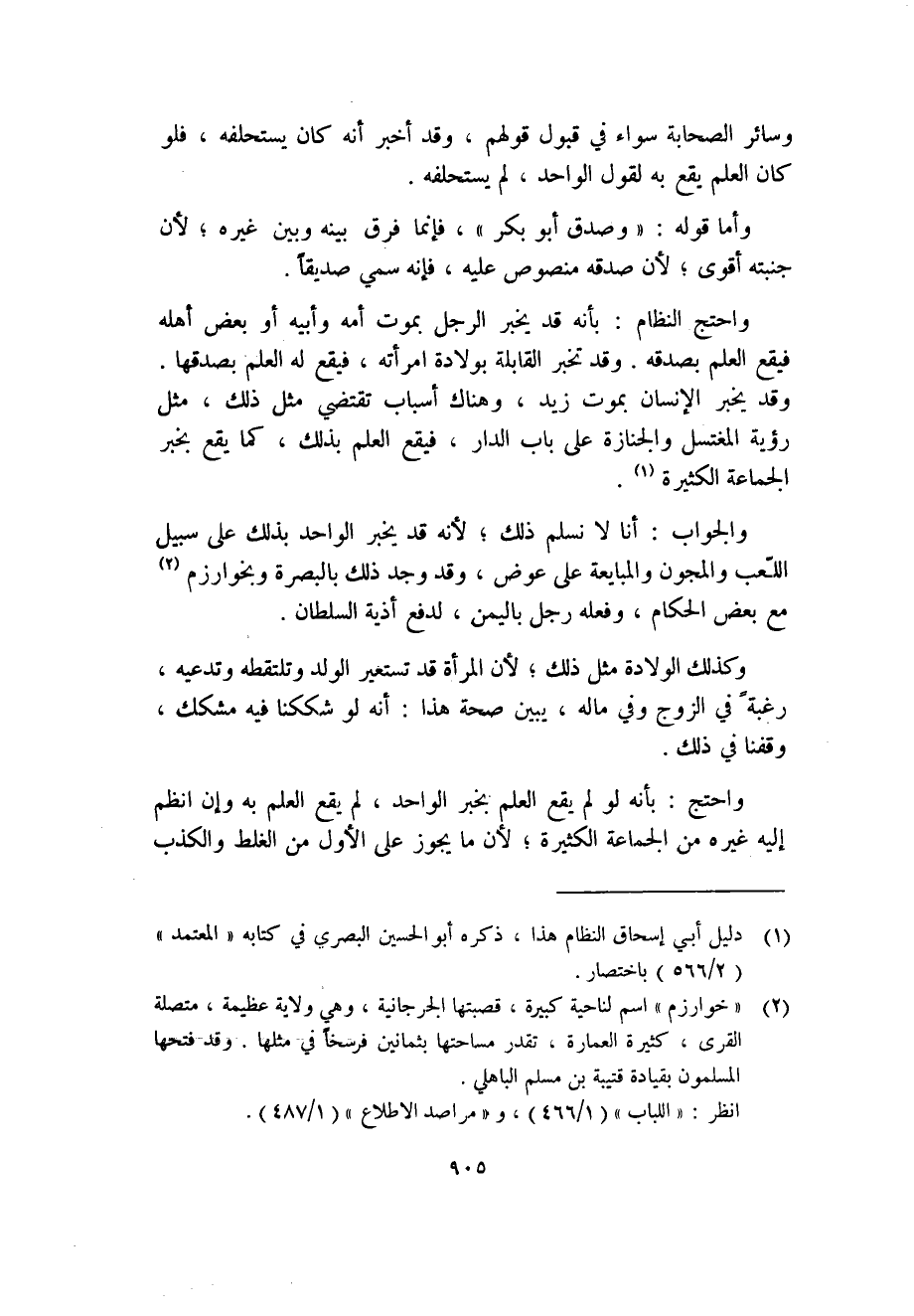 واحتج النظام: بأنه قد يخبر الرجل بموت أمه وأبيه أو بعض أهله فيقع العلم بصدقه. وقد تخبر القابلة بولادة امرأته، فيقع له العلم بصدقها.