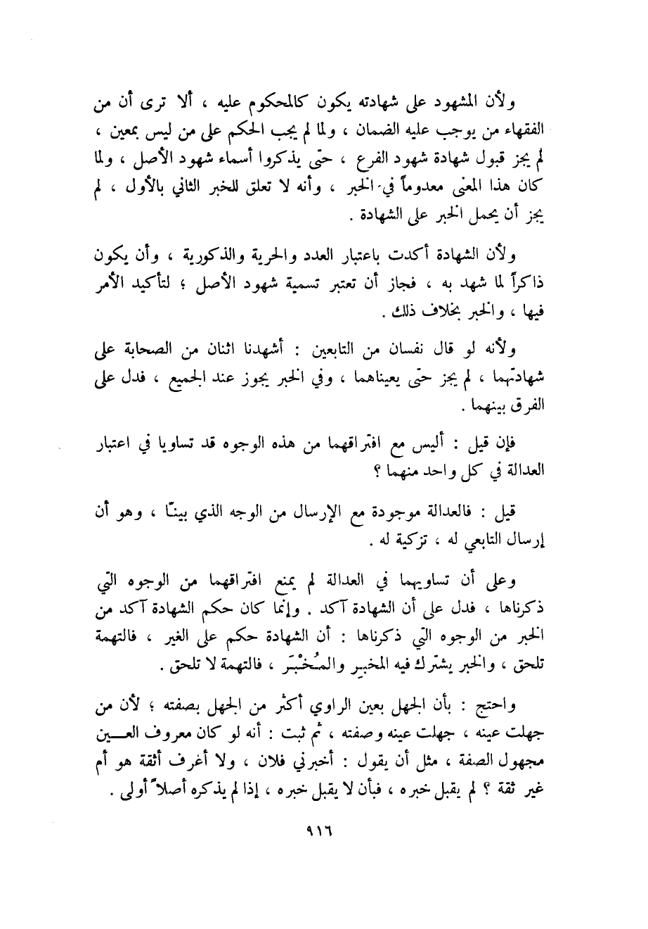 وعلى أن تساويهما في العدالة لم يمنع افراقهما من الوجوه التي ذكرناها، فدل على أن الشهادة آكد. وإنما كان حكم الشهادة آكد من الخبر من الوجوه التي ذكرناها: أن الشهادة حكم على الغير، فالتهمة تلحق، والخبر يشترك فيه المخبِر والمُخْبَر، فالتهمه لا تلحق.