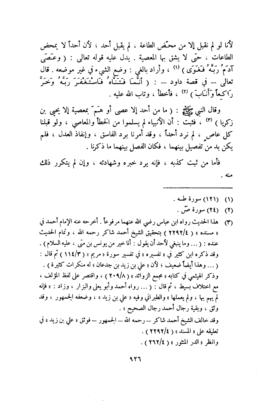 وقال النبي - صلى الله عليه وسلم -: (ما من أحد إلا عصى أو هَم بمعصيه إلا يحيى بن زكريا) (3) ، فثبت: أن الأنبياء لم يسلموا من الخطأ والمعاصي، ولو قبلنا كل عاص، لم نرد أحداً، وقد أمرنا برد الفاسق، وإنفاذ العدل، فلم يكن بد من تفصيل بينهما، فكان الفصل بينهما ما ذكرنا.