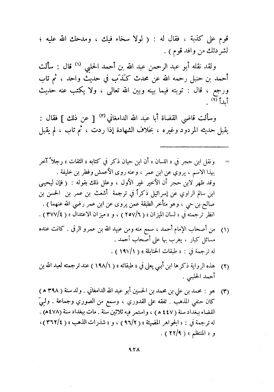 (2) هذه الرواية ذكرها ابن أبي يعلى في "طبقاته" (1/198) عند ترجمته لعبد الله بن أحمد الحلبي.
