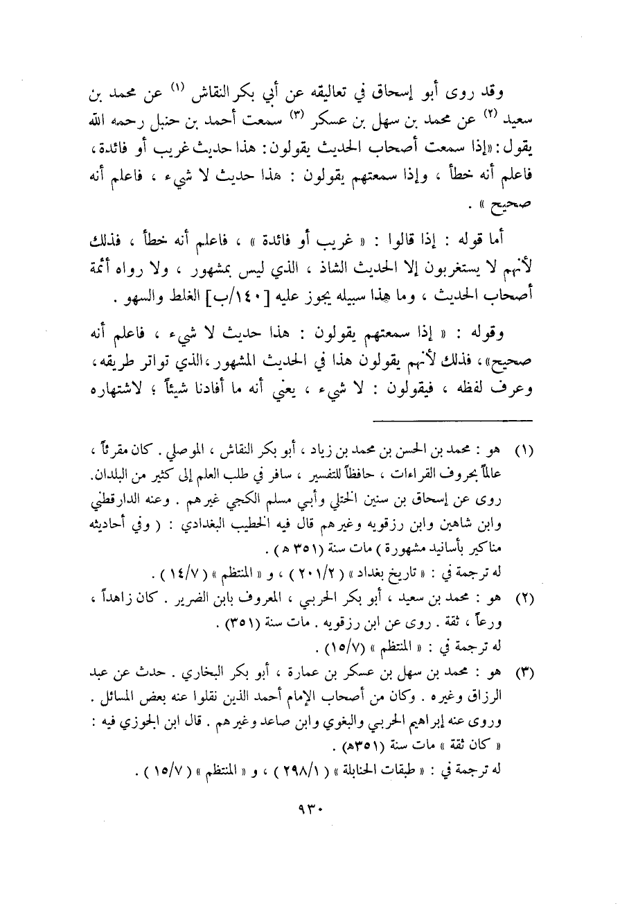 وقد روى أبو إسحاق في تعاليقه عن أبي بكر النقاش (1) عن محمد بن سعيد (2) عن محمد بن سهل بن عسكر (3) سمعت أحمد بن حنبل رحمه الله يقول: "إذا سمعت أصحاب الحديث يقولون: هذا حديث غريب أو فائدة، فاعلم أنه خطأ، وإذا سمعتهم يقولون: هذا حديث لاشيء، فاعلم أنه صحيح".