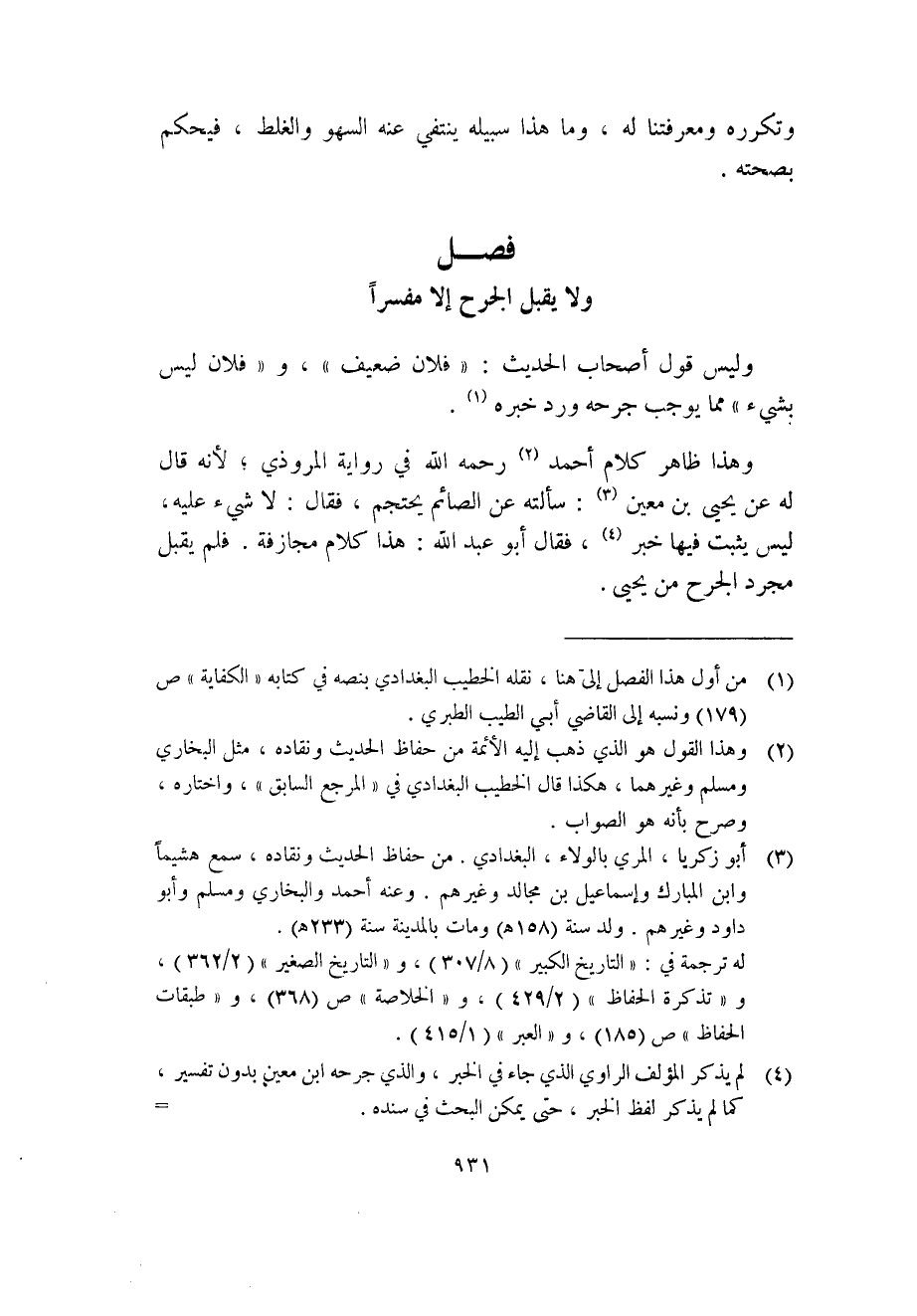 وهذا ظاهر كلام أحمد (2) رحمه الله في رواية المروذي؛ لأنه قال له عن يحيى بن معين (3) : سألته عن الصائم يحتجم، فقال: لا شيء عليه، ليس يثبت فيها خبر (4) ، فقال أبو عبد الله: هذا كلام مجازفة. فلم يقبل مجرد الجرح من يحيى.
