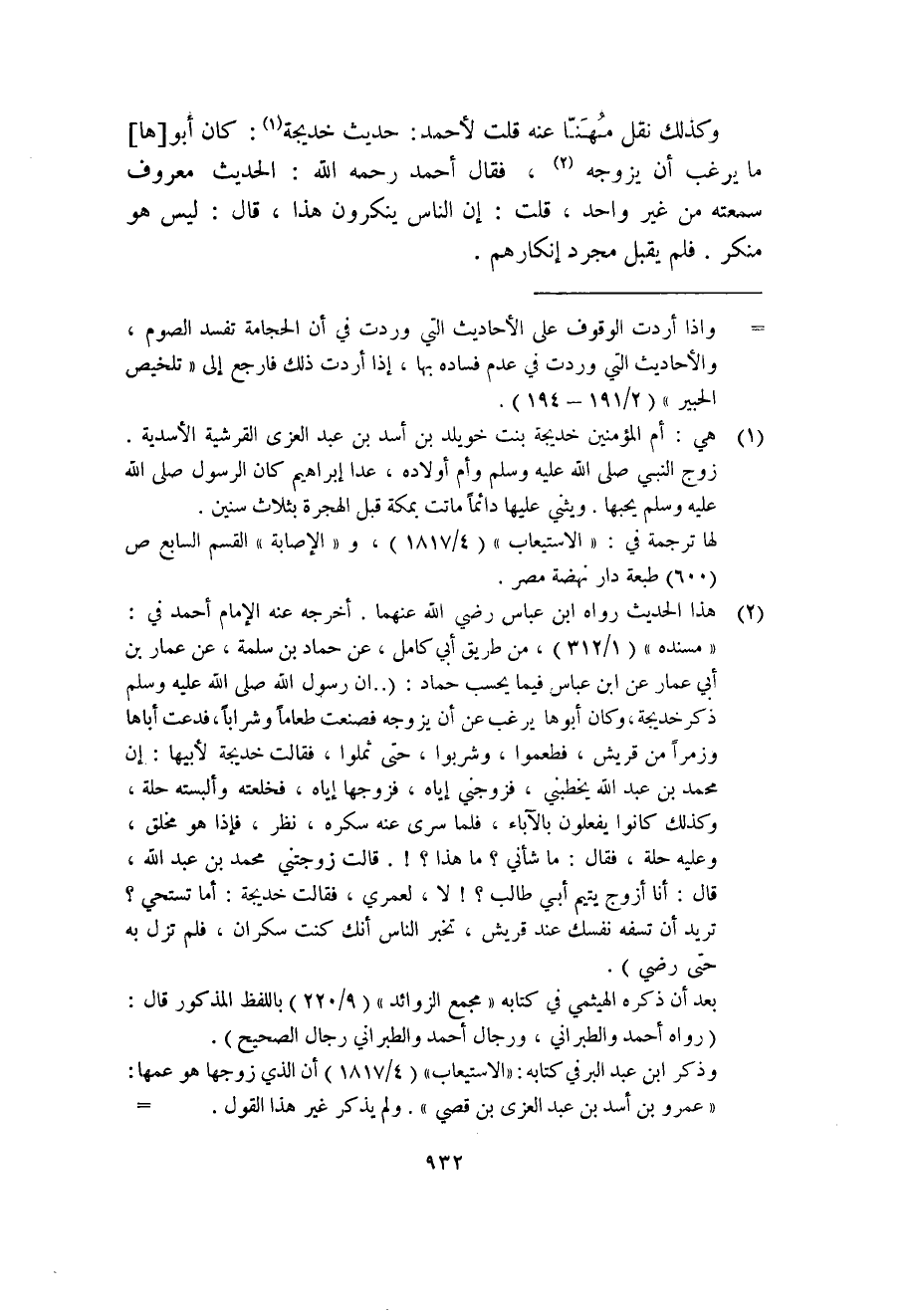 (2) هذا الحديث رواه ابن عباس رضي الله عنهما. أخرجه عنه الإمام أحمد في: "مسنده" (1/312) ، من طريق أبي كامل، عن حماد بن سلمة، عن عمار بن أبي عمار عن ابن عباس فيما يحسب حماد: (.. ان رسول الله صلى الله عليه وسلم ذكر خديجة، وكان أبوها يرغب عن أن يزوجه فصنعت طعاماً وشراباً، فدعت أباها وزمراً من قريش، فطعموا، وشربوا، حتى ثملوا، فقالت خديجة لأبيها: إن محمد بن عبد الله يخطبني، فزوجني إياه، فزوجها إياه، فخلعته وألبسته حلة، وكذلك كانوا يفعلون بالآباء، فلما سرى عنه سكره، نظر، فإذا هو مخلق، وعليه حلة، فقال: ما شأني؟ ما هذا؟!. قالت زوجتني محمد بن عبد الله، قال: أنا أزوج يتيم أبي طالب؟! لا، لعمري، فقالت خديجة: أما تستحي؟ تريد أن تسفه نفسك عند قريش، تخبر الناس أنك كنت سكران، فلم تزل به حتى رضي) .