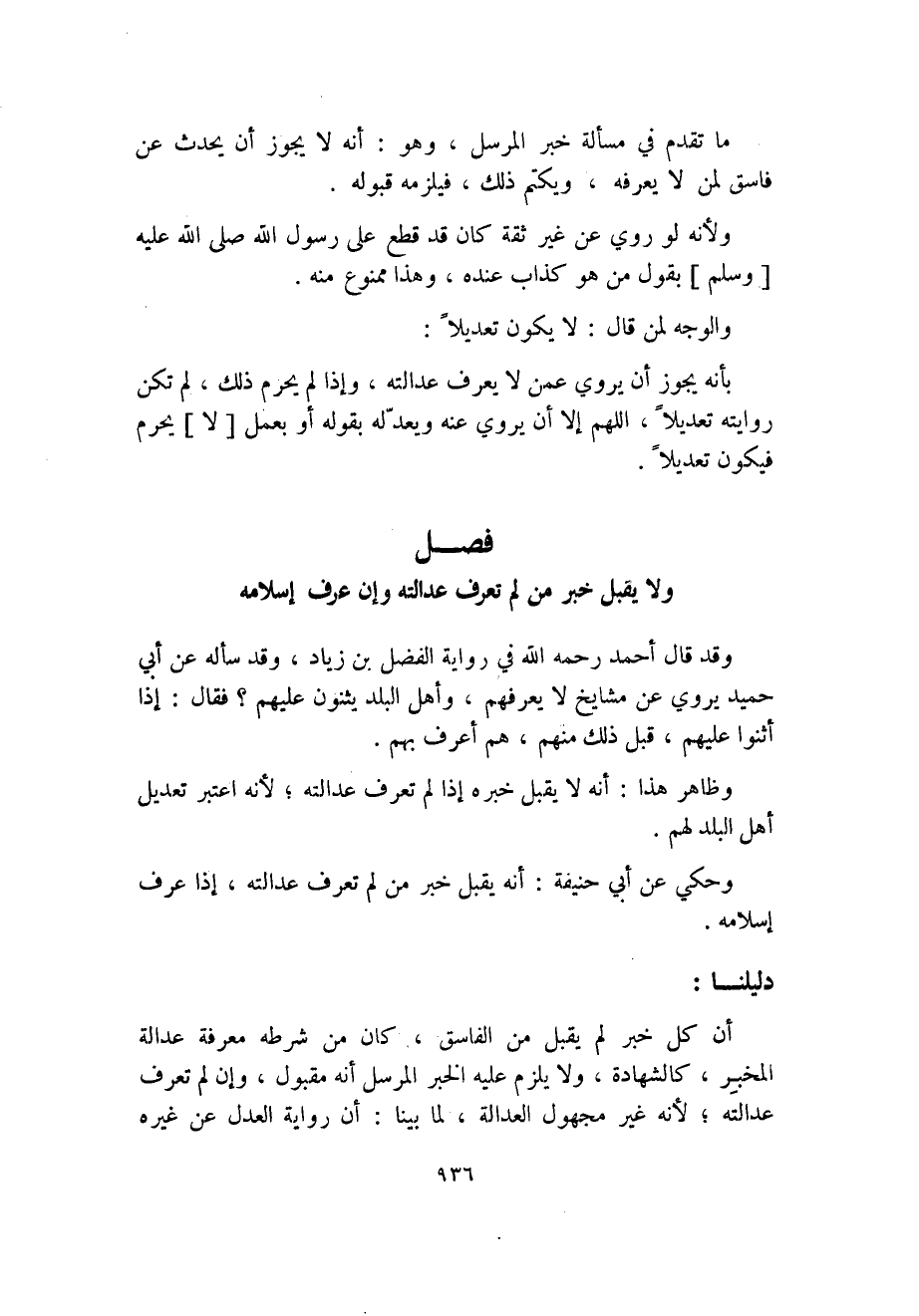 ولا يقبل خبر من لم تعرف عدالته وإن عوف إسلامه وقد قال أحمد رحمه الله في رواية الفضل بن زياد، وقد سأله عن أبي حميد يروي عن مشايخ لا يعرفهم، وأهل البلد يثنون عليهم؟ فقال: إذا
