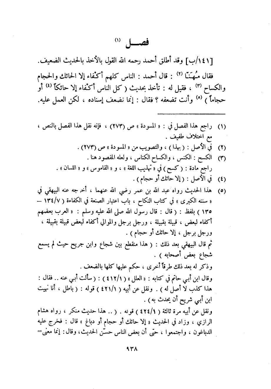 فقال مهَنّا (2) : قال أحمد: الناس كلهم أكْفاء إلا الحائك والحجام والكساح (3) ، فقيل له: تأخذ بحديث (كل الناس أكْفاء إلا حائكاً (4) أو حجاما) (5) وأنت تضعفة؟ فقال: إنما نضعف إسناده، لكن العمل عليه.