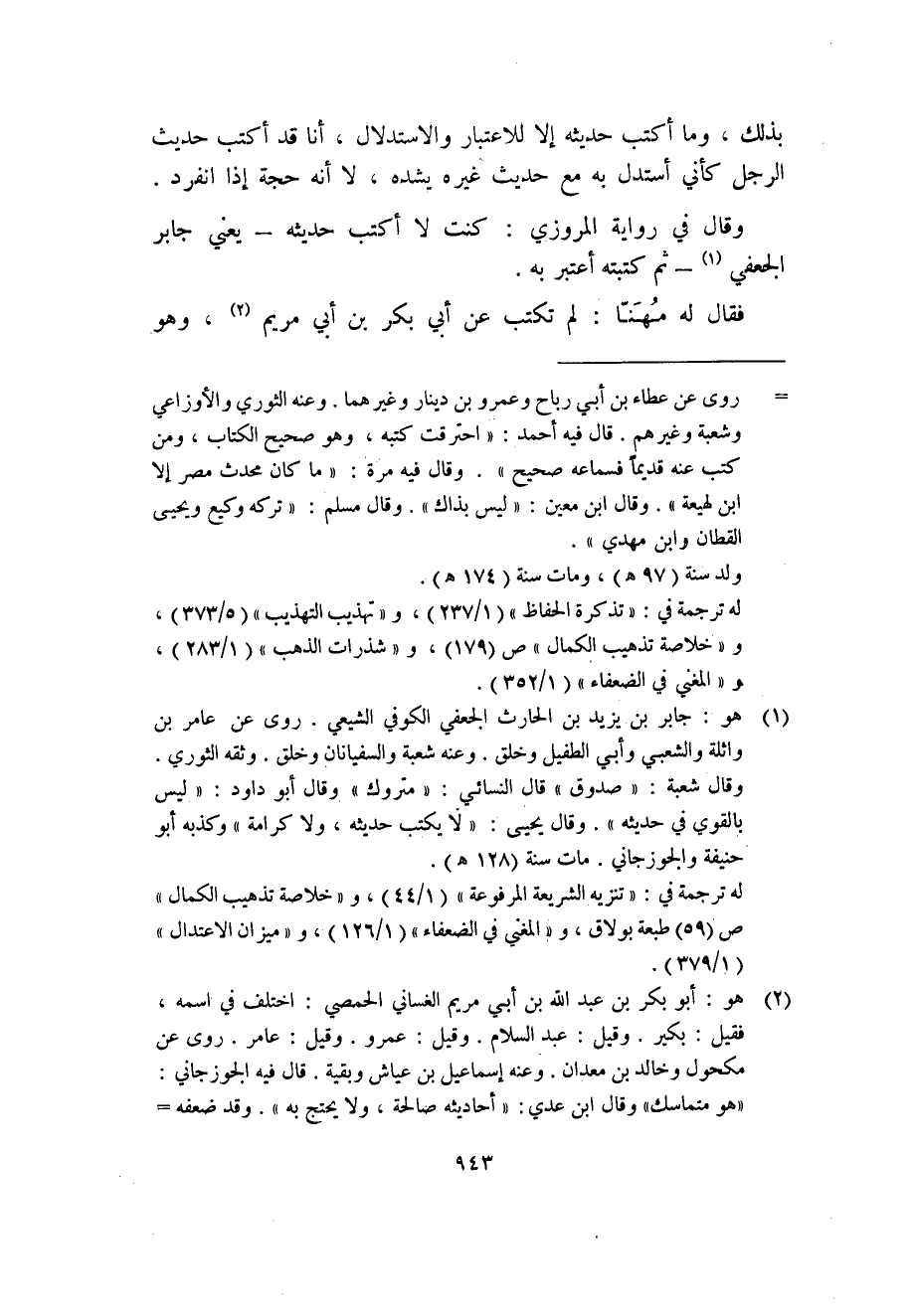 وقال في رواية المروزي: كنت لا أكتب حديثه -يعني جابر الجعفي (1) - ثم كتبته أعتبر به.