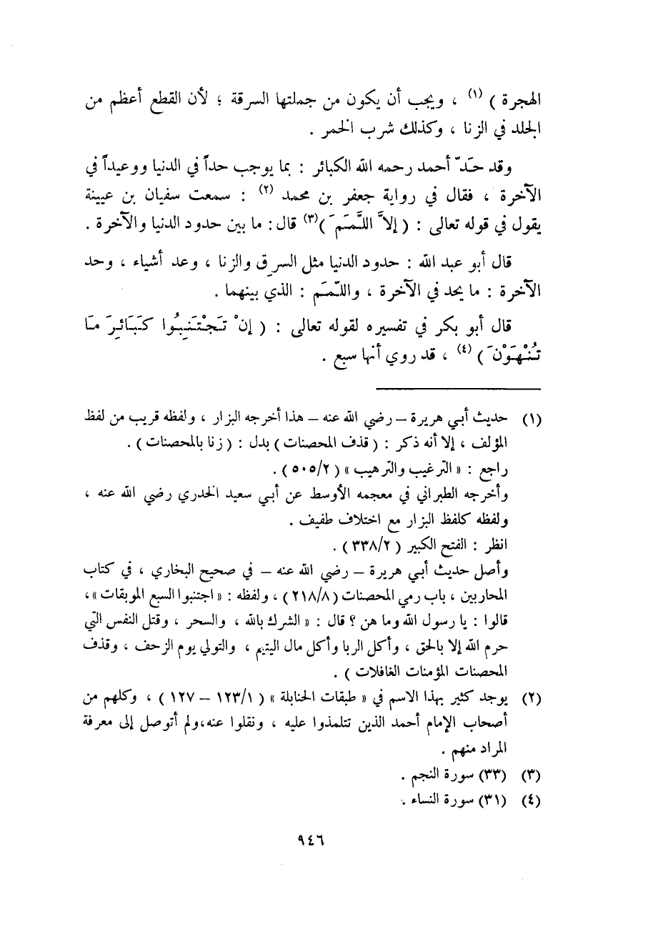 وقد حَدّ أحمد رحمه الله الكبائر: بما يوجب حداً في الدنيا ووعيداً في الآخرة، فقال في رواية جعفر بن محمد (2) : سمعت سفيان بن عيينة يقول في قوله تعالى: (إلا اللمَمَ) (3) قال: ما بين حدود الدنيا والآخرة.