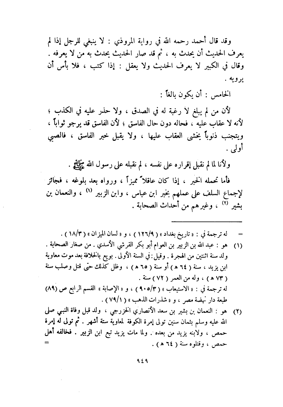 فأما تحمله الخبر، إذا كان عاقلا مميزاً، ورواه بعد، بلوغه، فجائز لإجماع السلف على عملهم بخبر ابن عباس، وابن الزبير (1) ، والنعمان بن بشير (2) ، وغيرهم من أحداث الصحابة.