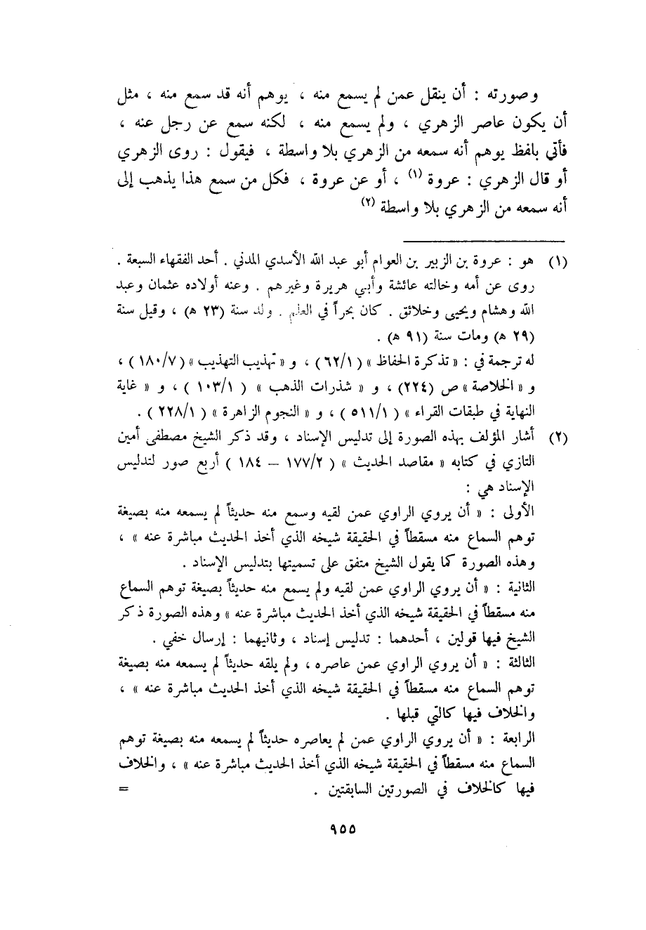 الرابعة: "أن يروي الراوي عمن لم يعاصره حديثاً لم يسمعه منه بصيغة توهم السماع منه مسقطاً في الحقيقة شيخه الذي أخذ الحديث مباشرة عنه"، والخلاف فيها كالخلاف في الصورتين السابقتين. =