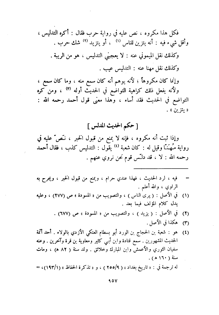 وإذا ثبت أنه مكروه، فإنه لا يمنع من قبول الخبر، نَص عليه في رواية مُهَنّا وقيل له: كان شعبة (4) يقول: التدليس كذب، فقال أحمد رحمه الله: لا، قد دلس قوم نحن نروي عنهم.