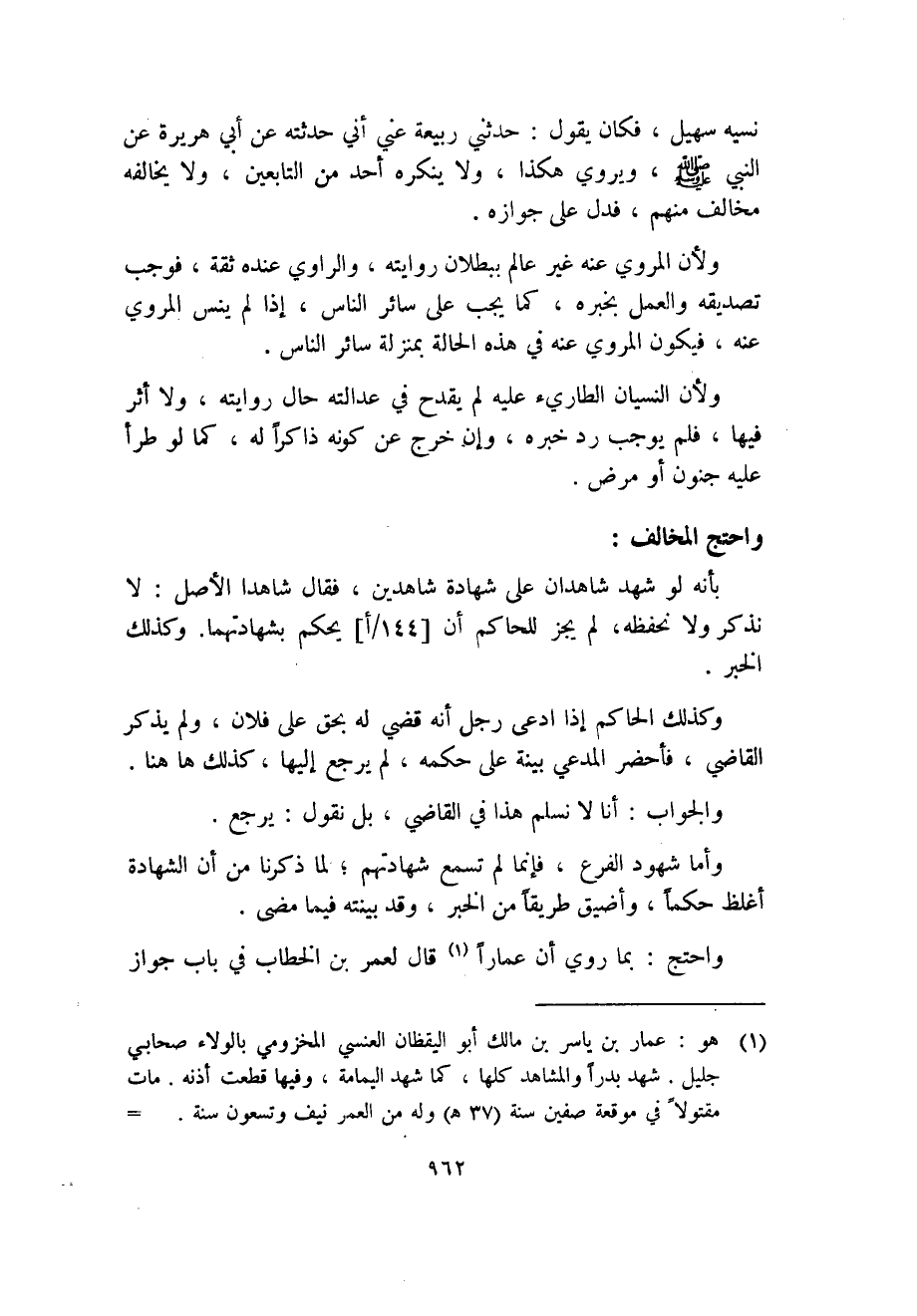 نسيه سهيل، فكان يقول: حدثني ربيعة عني أني حدثته عن أبي هريرة عن النبي - صلى الله عليه وسلم -، ويروي هكذا، ولا ينكره أحد من التابعين، ولا يخالفه مخالف منهم، فدل على جوازه.