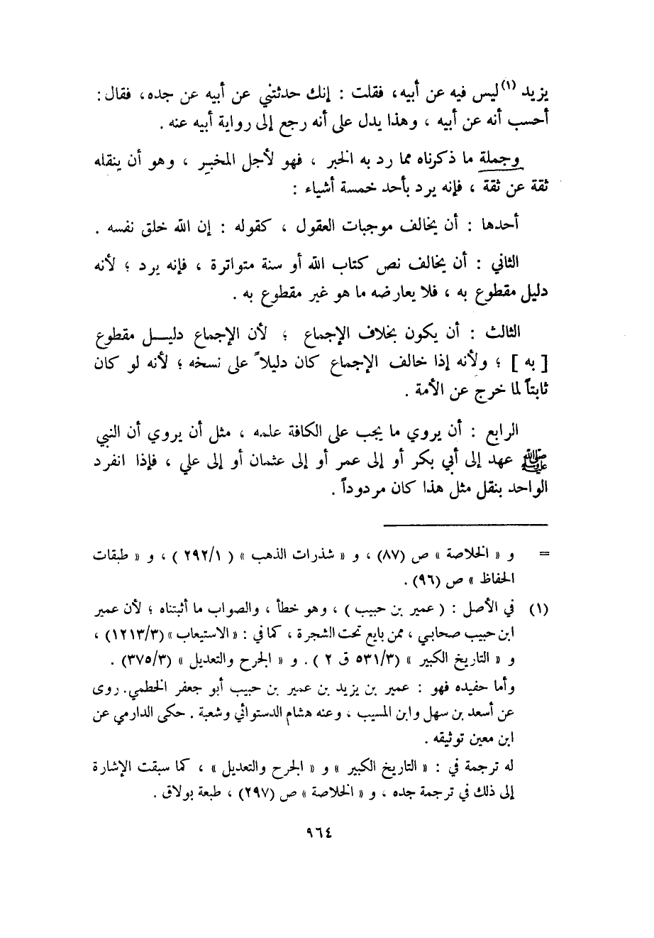 وجملة ما ذكرناه مما رد به الخبر، فهو لأجل المخبِر، وهو أن ينقله ثقة عن ثقة، فإنه يرد بأحد خمسه أشياء: