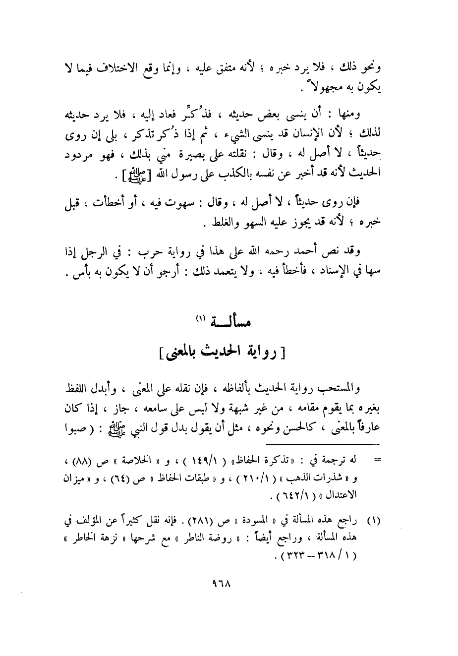 ومنها: أن ينسى بعض حديثه، فذُكِّر فعاد إليه، فلا يرد حديثه لذلك؛ لأن الإنسان قد ينسى الشيء، ثم إذا ذُكر تذكر، بلى إن روى حديثاً، لا أصل له، وقال: نقلته على بصيرة مني بذلك، فهو مردود الحديث لأنه قد أخبر عن نفسه بالكذب على رسول الله [صلى الله عليه وسلم] .