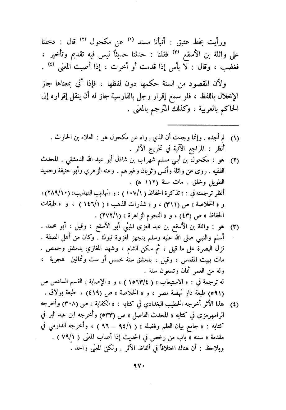 ورأيت بخط عتيق: أنبأنا مسند (1) عن مكحول (2) قال: دخلنا على واثلة بن الأسقع (3) فقلنا: حدثنا حديثاً ليس فيه تقديم وتأخير، فغضب، وقال: لا بأس إذا قدمت أو أخرت، إذا أصبت المعنى (4) .