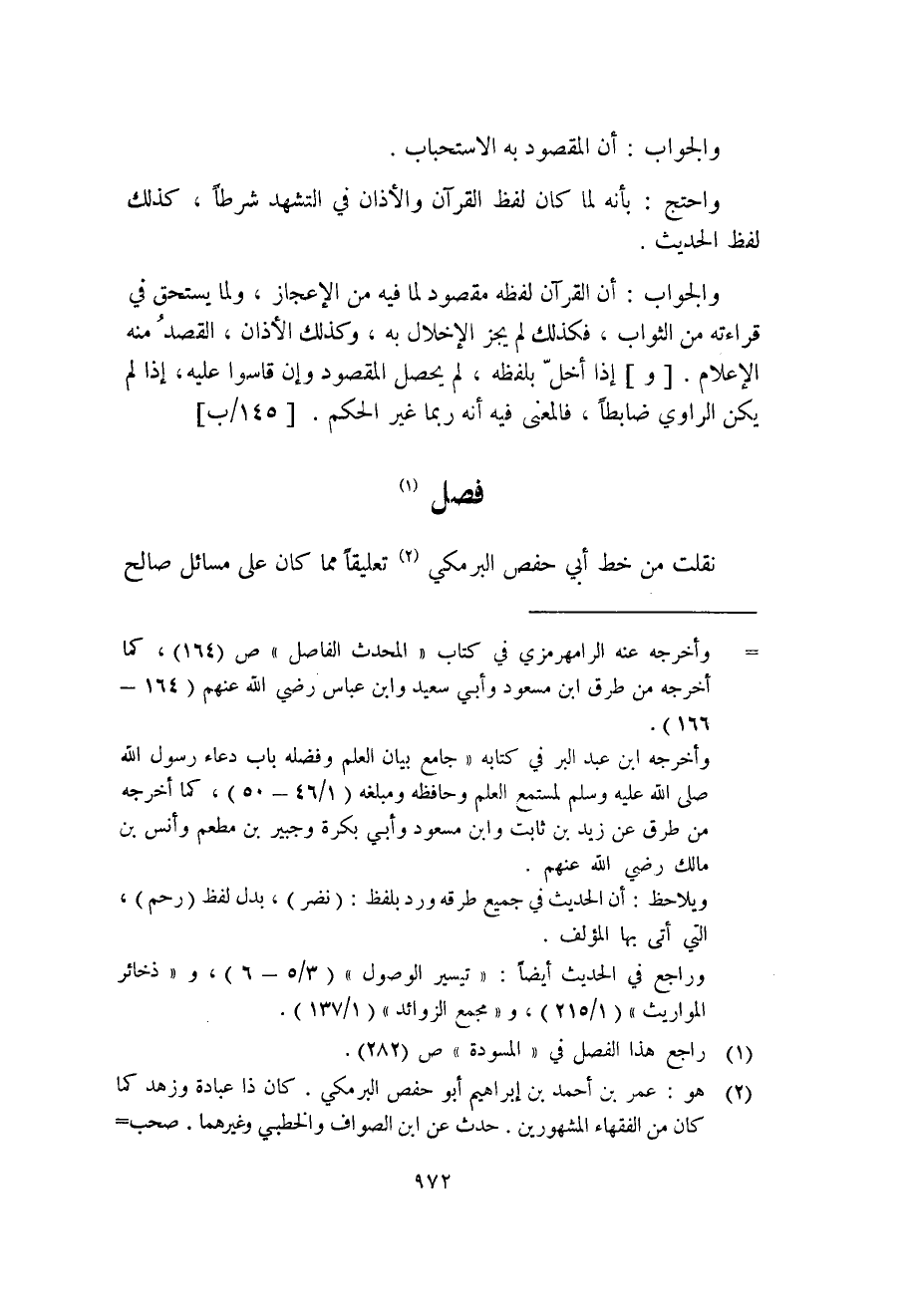 (2) هو: عمر بن أحمد بن إبراهيم أبو حفص البرمكي. كان ذا عبادة وزهد كما كان من الفقهاء المشهورين. حدث عن ابن الصواف والخطبي وغيرهما. صحب =