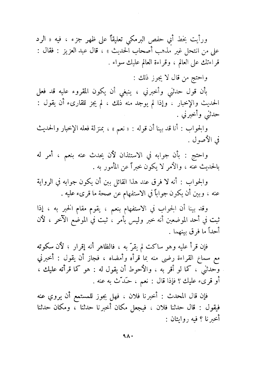 ورأيت بخط أبي حفص البرمكي تعليقاً على ظهر جزء، فيه "الرد على من انتحل غير مذهب أصحاب الحديث"، قال عبد العزيز: فقال: قراءتك على العالم، وقراءة العالم عليك سواء.