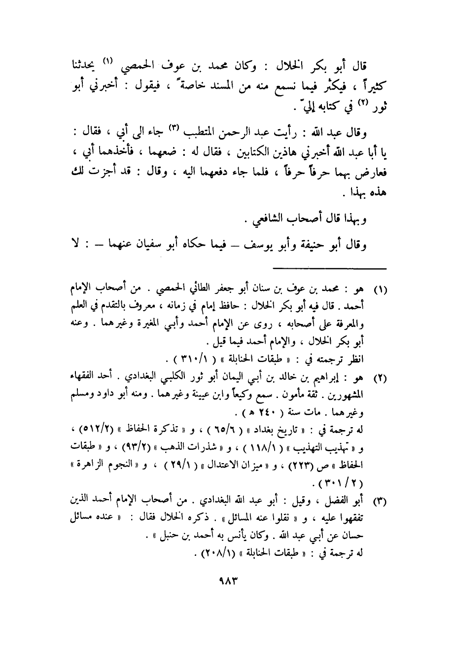 (1) هو: محمد بن عوف بن سنان أبو جعفر الطائي الحمصي. من أصحاب الإمام أحمد. قال فيه أبو بكر الخلال: حافظ إمام في زمانه، معروف بالتقدم في العلم والمعرفة على أصحابه، روى عن الإمام أحمد وأبي المغيرة وغيرهما. وعنه أبو بكر الخلال، والإمام أحمد فيما قيل.