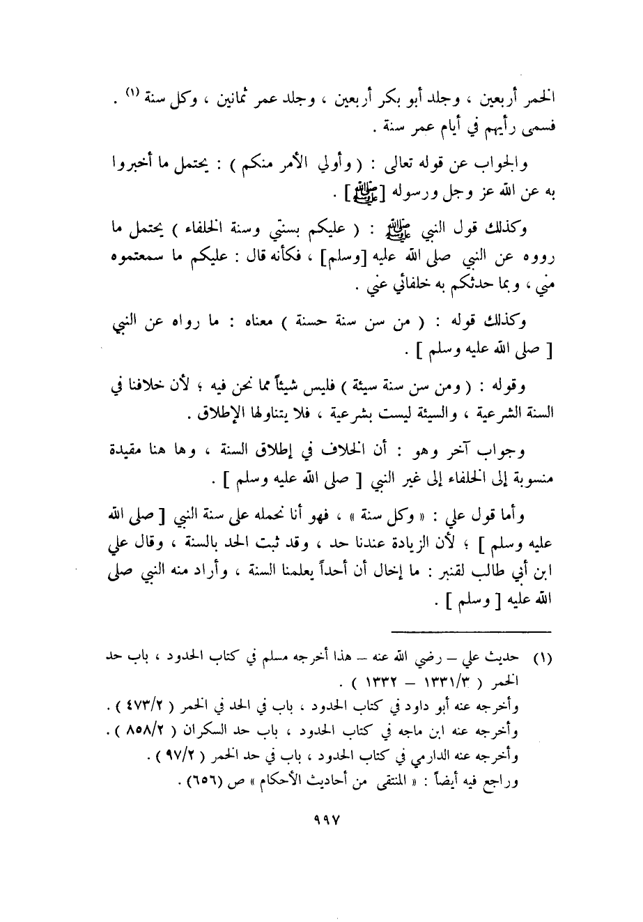 وجواب آخر وهو: أن الخلاف في إطلاق السنة، وها هنا مقيدة منسوبة إلى الخلفاء إلى غير النبي [صلى الله عليه وسلم] .