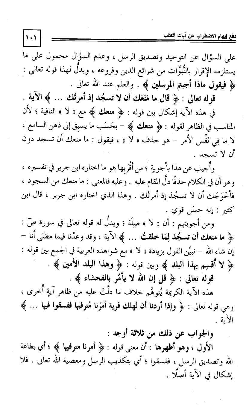 وَمِنْ أَجْوِبَتِهِمْ أَنَّ «لَا» صِلَةٌ وَيَدُلُّ قَوْلُهُ تَعَالَى فِي سُورَةِ «ص» مَا مَنَعَكَ أَنْ تَسْجُدَ لِمَا خَلَقْتُ الْآيَةَ [38] ، وَقَدْ وَعَدْنَا فِيمَا مَضَى أَنَّا إِنْ شَاءَ اللَّهُ نُبَيِّنُ الْقَوْلَ بِزِيَادَةِ «لَا» مَعَ شَوَاهِدِهِ الْعَرَبِيَّةِ فِي الْجَمْعِ بَيْنَ قَوْلِهِ: لَا أُقْسِمُ بِهَذَا الْبَلَدِ [90] ، وَبَيْنَ قَوْلِهِ: وَهَذَا الْبَلَدِ الْأَمِينِ [95 \ 3] .