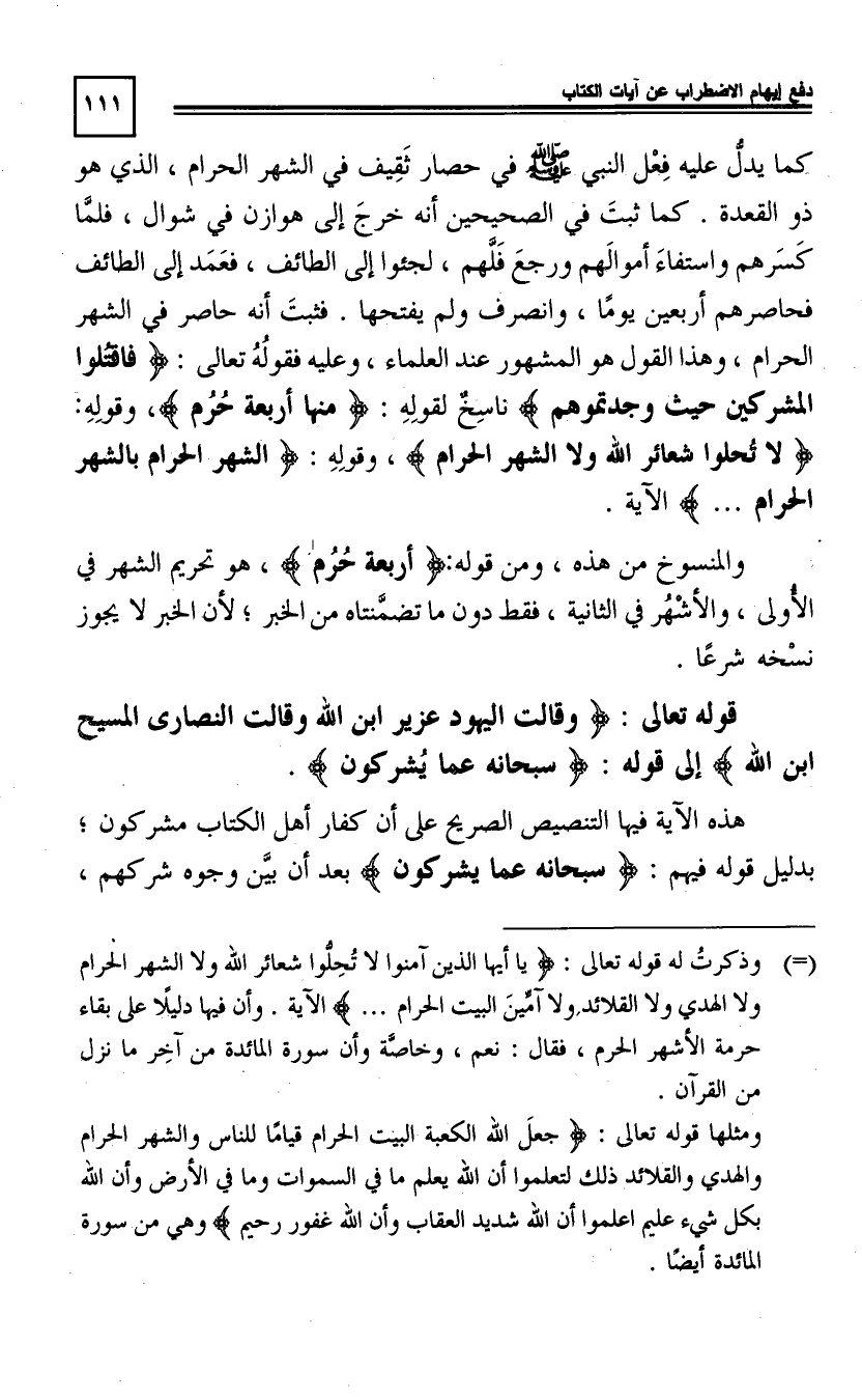 كَمَا يَدُلُّ عَلَيْهِ فِعْلُ النَّبِيِّ صَلَّى اللَّهُ عَلَيْهِ وَسَلَّمَ فِي حِصَارِ ثَقِيفٍ فِي الشَّهْرِ الْحَرَامِ، الَّذِي هُوَ ذُو الْقَعْدَةِ، كَمَا ثَبَتَ فِي الصَّحِيحَيْنِ أَنَّهُ خَرَجَ إِلَى هَوَازِنَ فِي شَوَّالٍ، فَلَمَّا كَسَرَهُمْ وَاسْتَفَاءَ أَمْوَالَهُمْ وَرَجَعَ فَلُّهُمْ لَجَأُوا إِلَى الطَّائِفِ، فَعَمَدَ إِلَى الطَّائِفِ فَحَاصَرَهُمْ أَرْبَعِينَ يَوْمًا وَانْصَرَفَ وَلَمْ يَفْتَحْهَا، فَثَبَتَ أَنَّهُ حَاصَرَ فِي الشَّهْرِ الْحَرَامِ وَهَذَا الْقَوْلُ هُوَ الْمَشْهُورُ عِنْدَ الْعُلَمَاءِ وَعَلَيْهِ فَقَوْلُهُ تَعَالَى: فَاقْتُلُوا الْمُشْرِكِينَ حَيْثُ وَجَدْتُمُوهُمْ نَاسِخٌ لِقَوْلِهِ مِنْهَا أَرْبَعَةٌ حُرُمٌ وَقَوْلِهِ: لَا تُحِلُّوا شَعَائِرَ اللَّهِ وَلَا الشَّهْرَ الْحَرَامَ [5] ، وَقَوْلِهِ: الشَّهْرُ الْحَرَامُ بِالشَّهْرِ الْحَرَامِ الْآيَةَ [2 \ 194] .