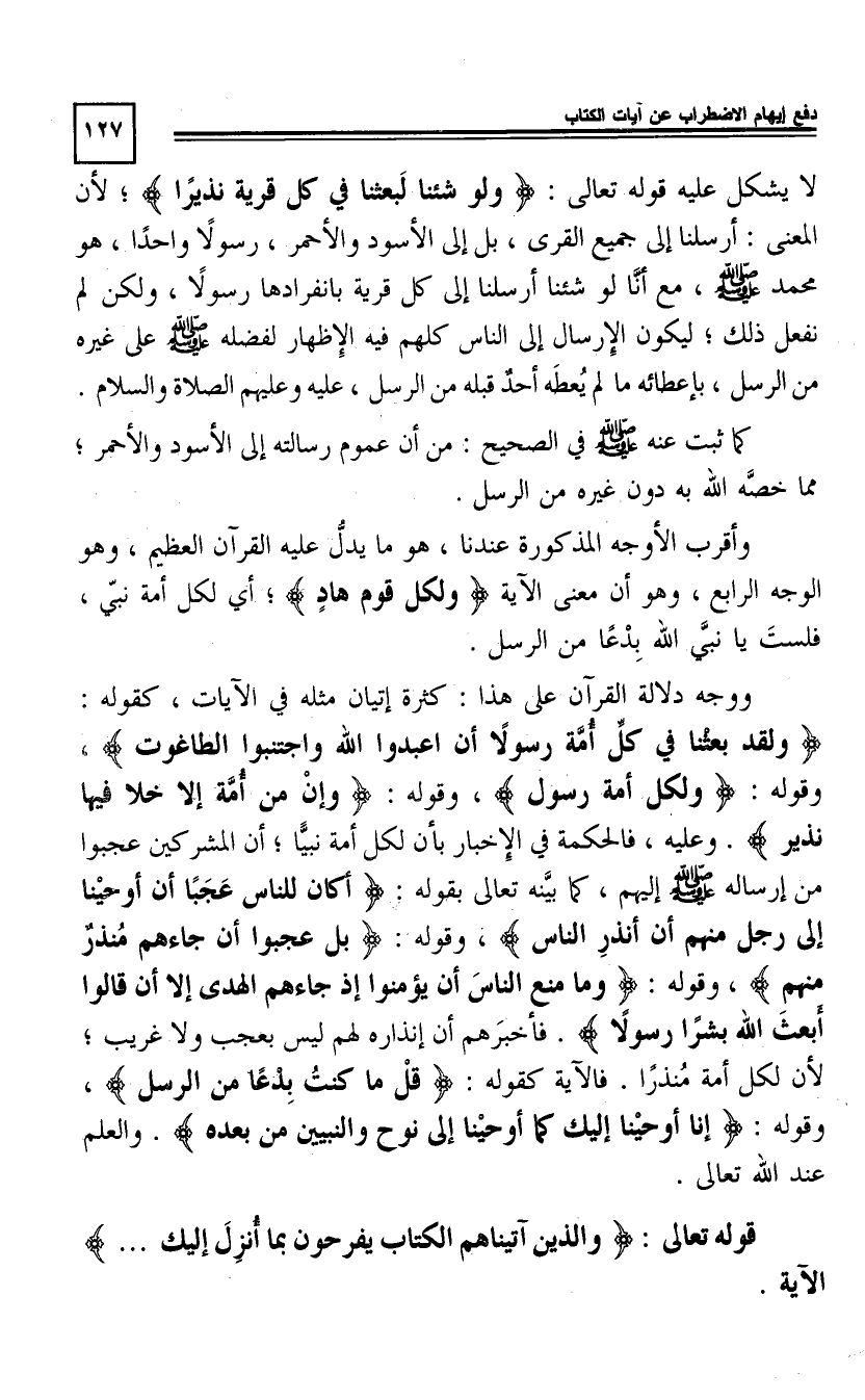 لَا يُشْكِلُ عَلَيْهِ قَوْلُهُ تَعَالَى: وَلَوْ شِئْنَا لَبَعَثْنَا فِي كُلِّ قَرْيَةٍ نَذِيرًا [25 \ 51] ، لِأَنَّ الْمَعْنَى أَرْسَلْنَا إِلَى جَمِيعِ الْقُرَى، بَلْ إِلَى الْأَسْوَدِ وَالْأَحْمَرِ رَسُولًا وَاحِدًا، هُوَ مُحَمَّدٌ صَلَّى اللَّهُ عَلَيْهِ وَسَلَّمَ، مَعَ أَنَّا لَوْ شِئْنَا أَرْسَلْنَا إِلَى كُلِّ قَرْيَةٍ بِانْفِرَادِهَا رَسُولًا، وَلَكِنْ لَمْ نَفْعَلْ ذَلِكَ لِيَكُونَ الْإِرْسَالُ إِلَى النَّاسِ كُلِّهِمْ فِيهِ الْإِظْهَارُ لِفَضْلِهِ صَلَّى اللَّهُ عَلَيْهِ وَسَلَّمَ عَلَى غَيْرِهِ مِنَ الرُّسُلِ، بِإِعْطَائِهِ مَا لَمْ يُعْطَهُ أَحَدٌ قَبْلَهُ مِنَ الرُّسُلِ عَلَيْهِ وَعَلَيْهِمُ الصَّلَاةُ وَالسَّلَامُ.