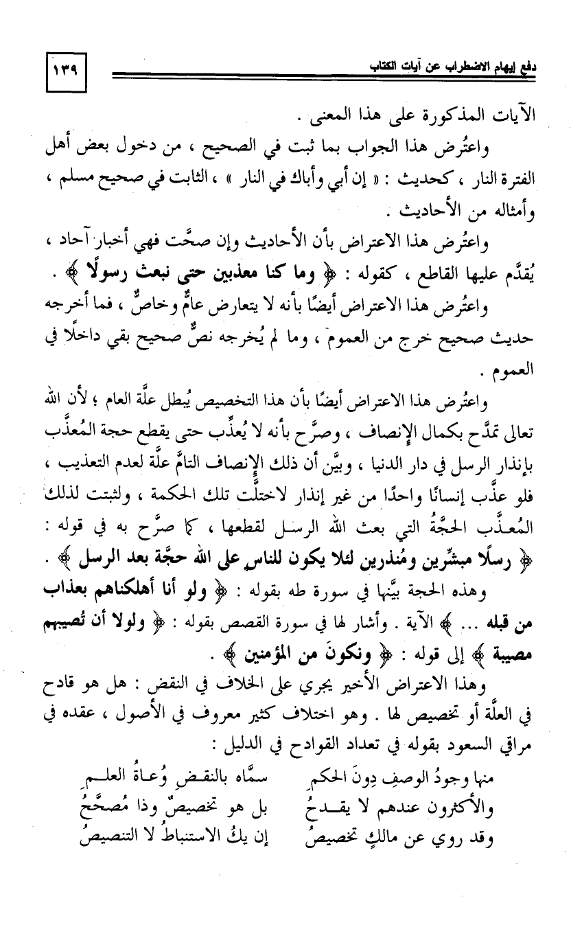 وَاعْتُرِضَ هَذَا الِاعْتِرَاضُ أَيْضًا بِأَنَّ هَذَا التَّخْصِيصَ يُبْطِلُ عِلَّةَ الْعَامِّ لِأَنَّ اللَّهَ تَعَالَى تَمَدَّحَ بِكَمَالِ الْإِنْصَافِ وَصَرَّحَ بِأَنَّهُ لَا يُعَذِّبُ حَتَّى يَقْطَعَ حُجَّةَ الْمُعَذَّبِ بِإِنْذَارِ الرُّسُلِ فِي دَارِ الدُّنْيَا، وَبَيَّنَ أَنَّ ذَلِكَ الْإِنْصَافَ التَّامَّ عِلَّةٌ لِعَدَمِ التَّعْذِيبِ، فَلَوْ عَذَّبَ إِنْسَانًا وَاحِدًا مِنْ غَيْرِ إِنْذَارٍ لَاخْتَلَّتْ تِلْكَ الْحِكْمَةُ، وَلَثَبَتَتْ لِذَلِكَ الْمُعَذَّبِ الْحُجَّةُ الَّتِي بَعَثَ اللَّهُ الرُّسُلَ لِقَطْعِهَا، كَمَا صَرَّحَ بِهِ فِي قَوْلِهِ: رُسُلًا مُبَشِّرِينَ وَمُنْذِرِينَ لِئَلَّا يَكُونَ لِلنَّاسِ عَلَى اللَّهِ حُجَّةٌ بَعْدَ الرُّسُلِ [4 \ 165] .