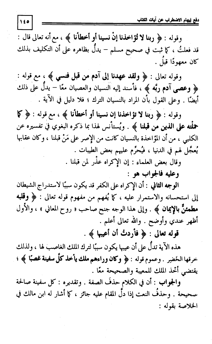 وَقَوْلَهُ: رَبَّنَا لَا تُؤَاخِذْنَا إِنْ نَسِينَا أَوْ أَخْطَأْنَا [2: 286] مَعَ أَنَّهُ تَعَالَى قَالَ: «قَدْ فَعَلْتُ» ، كَمَا ثَبَتَ فِي صَحِيحِ مُسْلِمٍ، يَدُلُّ بِظَاهِرِهِ عَلَى أَنَّ التَّكْلِيفَ بِذَلِكَ كَانَ مَعْهُودًا قَبْلُ، وَقَوْلُهُ تَعَالَى: وَلَقَدْ عَهِدْنَا إِلَى آدَمَ مِنْ قَبْلُ فَنَسِيَ [20 \ 115] مَعَ قَوْلِهِ: وَعَصَى آدَمُ رَبَّهُ [20 \ 121] ، فَأَسْنَدَ إِلَيْهِ النِّسْيَانَ وَالْعِصْيَانَ مَعًا، يَدُلُّ عَلَى ذَلِكَ أَيْضًا، وَعَلَى الْقَوْلِ بِأَنَّ الْمُرَادَ بِالنِّسْيَانِ التَّرْكُ، فَلَا دَلِيلَ فِي الْآيَةِ.
