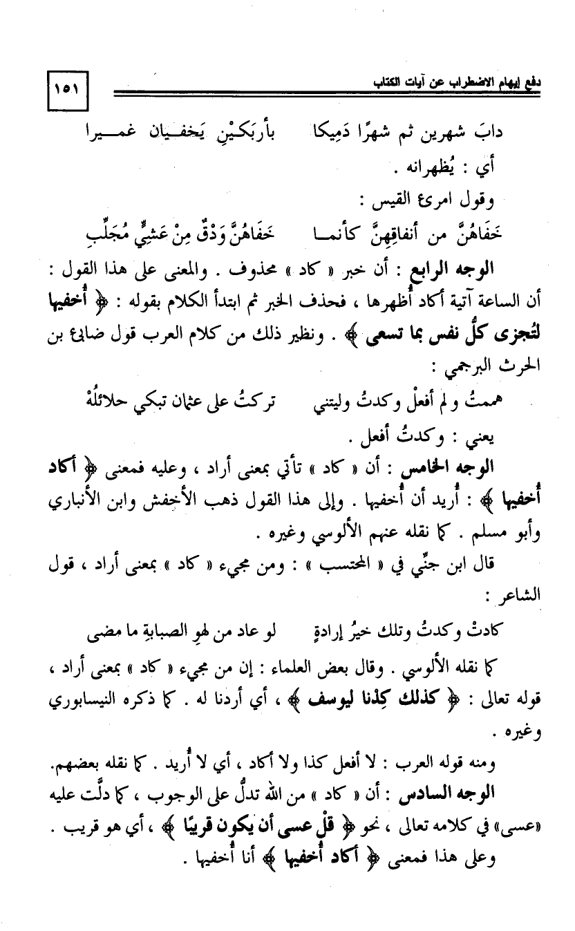 الْوَجْهُ الْخَامِسُ: أَنَّ كَادَ تَأْتِي بِمَعْنَى أَرَادَ، وَعَلَيْهِ فَمَعْنَى: أَكَادُ أُخْفِيهَا أُرِيدُ أَنَّ أُخْفِيَهَا، وَإِلَى هَذَا الْقَوْلِ ذَهَبَ الْأَخْفَشُ وَابْنُ الْأَنْبَارِيِّ وَأَبُو مُسْلِمٍ كَمَا نَقَلَهُ عَنْهُمُ الْأَلُوسِيُّ وَغَيْرُهُ.