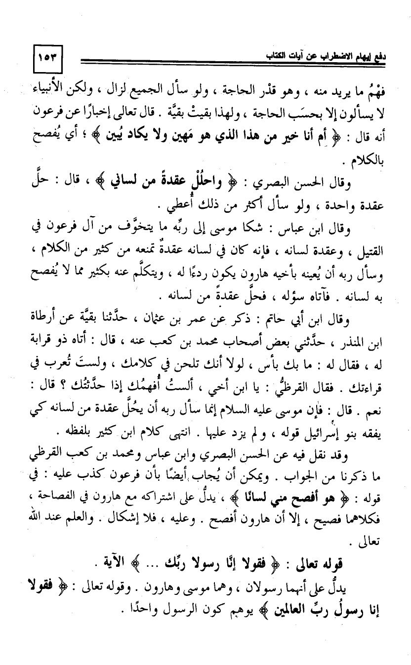 فَهْمُ مَا يُرِيدُ مِنْهُ، وَهُوَ قَدْرُ الْحَاجَةِ، وَلَوْ سَأَلَ الْجَمِيعَ لَزَالَ، وَلَكِنَّ الْأَنْبِيَاءَ لَا يَسْأَلُونَ إِلَّا بِحَسَبِ الْحَاجَةِ، وَلِهَذَا بَقِيَتْ بَقِيَّةٌ، قَالَ تَعَالَى إِخْبَارًا عَنْ فِرْعَوْنَ أَنَّهُ قَالَ: أَمْ أَنَا خَيْرٌ مِنْ هَذَا الَّذِي هُوَ مَهِينٌ وَلَا يَكَادُ يُبِينُ [43 52] ، أَيْ يُفْصِحُ بِالْكَلَامِ.