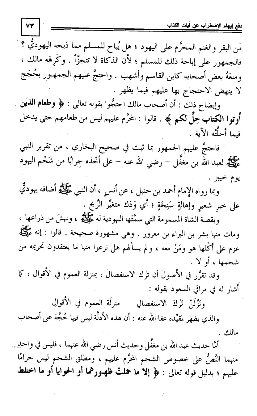 مِنَ الْبَقَرِ وَالْغَنَمِ الْمُحَرَّمِ عَلَى الْيَهُودِ، هَلْ يُبَاحُ لِلْمُسْلِمِ مِمَّا ذَبَحَهُ الْيَهُودِيُّ؟ فَالْجُمْهُورُ عَلَى إِبَاحَةِ ذَلِكَ لِلْمُسْلِمِ لِأَنَّ الذَّكَاةَ لَا تَتَجَزَّأُ، وَكَرِهَهُ مَالِكٌ وَمَنَعَهُ بَعْضُ أَصْحَابِهِ كَابْنِ الْقَاسْمِ وَأَشْهَبَ، وَاحْتَجَّ عَلَيْهِمُ الْجُمْهُورُ بِحُجَجٍ لَا يَنْهَضُ الِاحْتِجَاجُ بِهَا عَلَيْهِمْ فِيمَا يَظْهَرُ، وَإِيضَاحُ ذَلِكَ أَنَّ أَصْحَابَ مَالِكٍ احْتَجُّوا بِقَوْلِهِ تَعَالَى: وَطَعَامُ الَّذِينَ أُوتُوا الْكِتَابَ حِلٌّ لَكُمْ قَالُوا: