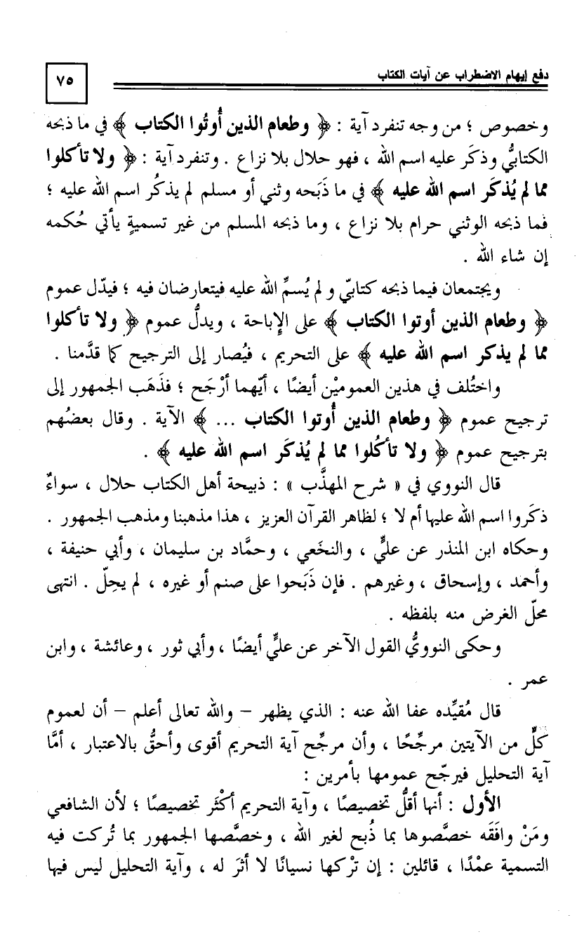 فَيَدُلُّ عُمُومُ: وَطَعَامُ الَّذِينَ أُوتُوا الْكِتَابَ عَلَى الْإِبَاحَةِ، وَيَدُلُّ عُمُومُ: وَلَا تَأْكُلُوا مِمَّا لَمْ يُذْكَرِ اسْمُ اللَّهِ عَلَيْهِ عَلَى التَّحْرِيمِ، فَيُصَارُ إِلَى التَّرْجِيحِ كَمَا قَدَّمْنَا.