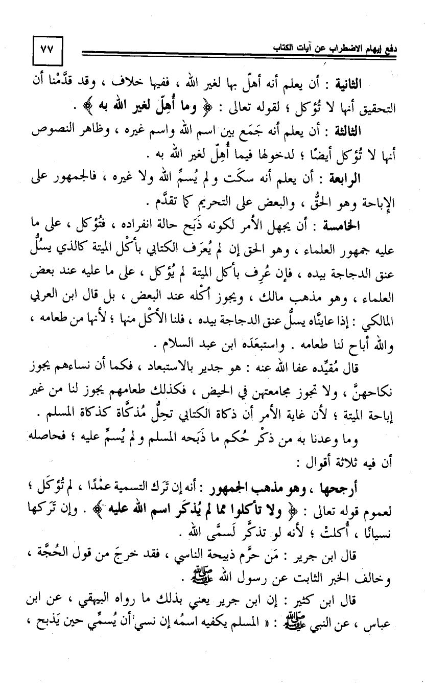 قَالَ ابْنُ جَرِيرٍ مَنْ حَرَّمَ ذَبِيحَةَ النَّاسِي فَقَدْ خَرَجَ مِنْ قَوْلِ الْحُجَّةِ وَخَالَفَ الْخَبَرَ الثَّابِتَ عَنْ رَسُولِ اللَّهِ صَلَّى اللَّهُ عَلَيْهِ وَسَلَّمَ.