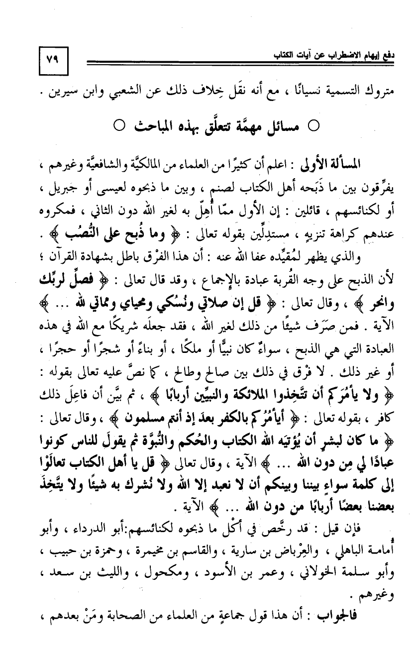 الْمَسْأَلَةُ الْأُولَى: اعْلَمْ أَنَّ كَثِيرًا مِنَ الْعُلَمَاءِ مِنَ الْمَالِكِيَّةِ وَالشَّافِعِيَّةِ وَغَيْرِهِمْ يُفَرِّقُونَ بَيْنَ مَا ذَبَحَهُ أُهْلُ الْكِتَابِ لِصَنَمٍ، وَبَيْنَ مَا ذَبَحُوهُ لِعِيسَى أَوْ جِبْرِيلَ، أَوْ لِكَنَائِسِهِمْ، قَائِلِينَ: إِنَّ الْأَوَّلَ مِمَّا أُهِلَّ بِهِ لِغَيْرِ اللَّهِ دُونَ الثَّانِي عِنْدَهُمْ كَرَاهَةَ تَنْزِيهٍ، مُسْتَدِلِّينَ بِقَوْلِهِ تَعَالَى: وَمَا ذُبِحَ عَلَى النُّصُبِ [5 3] .