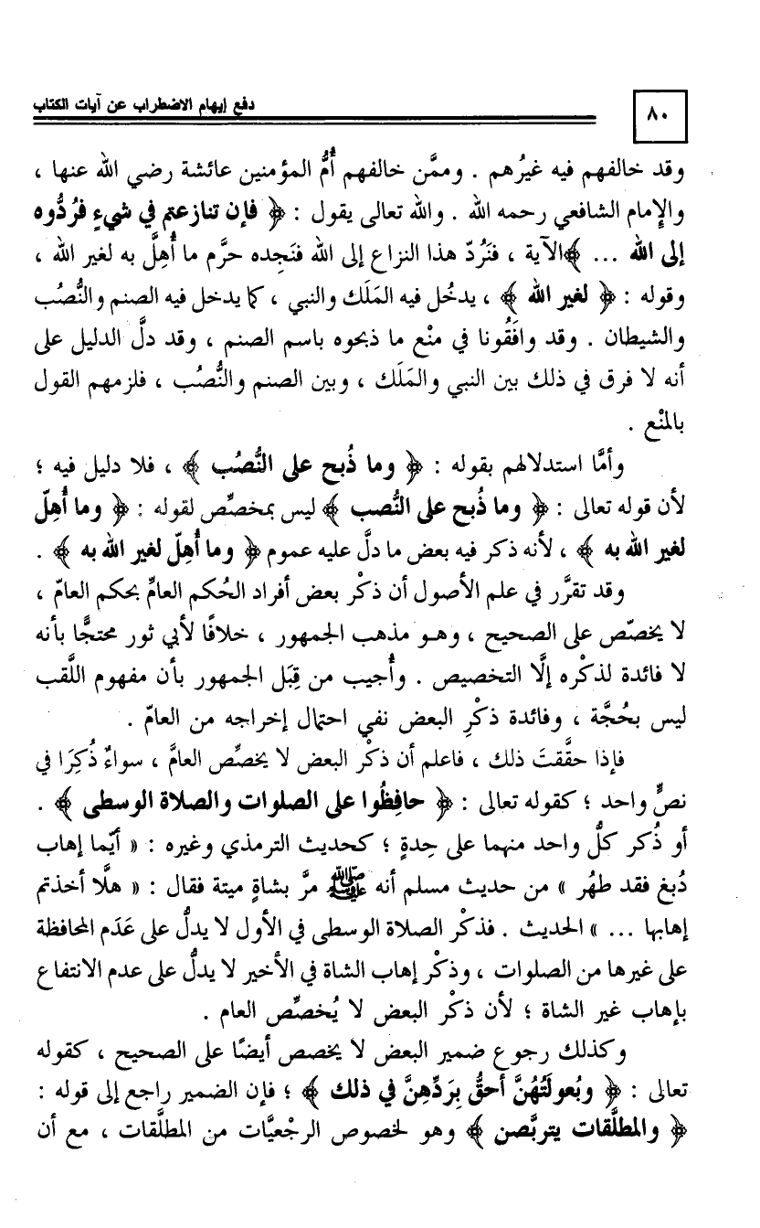 وَقَدْ خَالَفَهُمْ فِيهِ غَيْرُهُمْ. وَمِمَّنْ خَالَفَهُمْ أُمُّ الْمُؤْمِنِينَ عَائِشَةُ رَضِيَ اللَّهُ عَنْهَا وَالْإِمَامُ الشَّافِعِيُّ رَحِمَهُ اللَّهُ، وَاللَّهُ تَعَالَى يَقُولُ: فَإِنْ تَنَازَعْتُمْ فِي شَيْءٍ فَرُدُّوهُ إِلَى اللَّهِ الْآيَةَ [4 59] ، فَنَرُدُّ هَذَا النِّزَاعَ إِلَى اللَّهِ فَنَجِدُهُ حَرَّمَ مَا أَهَلَّ بِهِ لِغَيْرِ اللَّهِ.