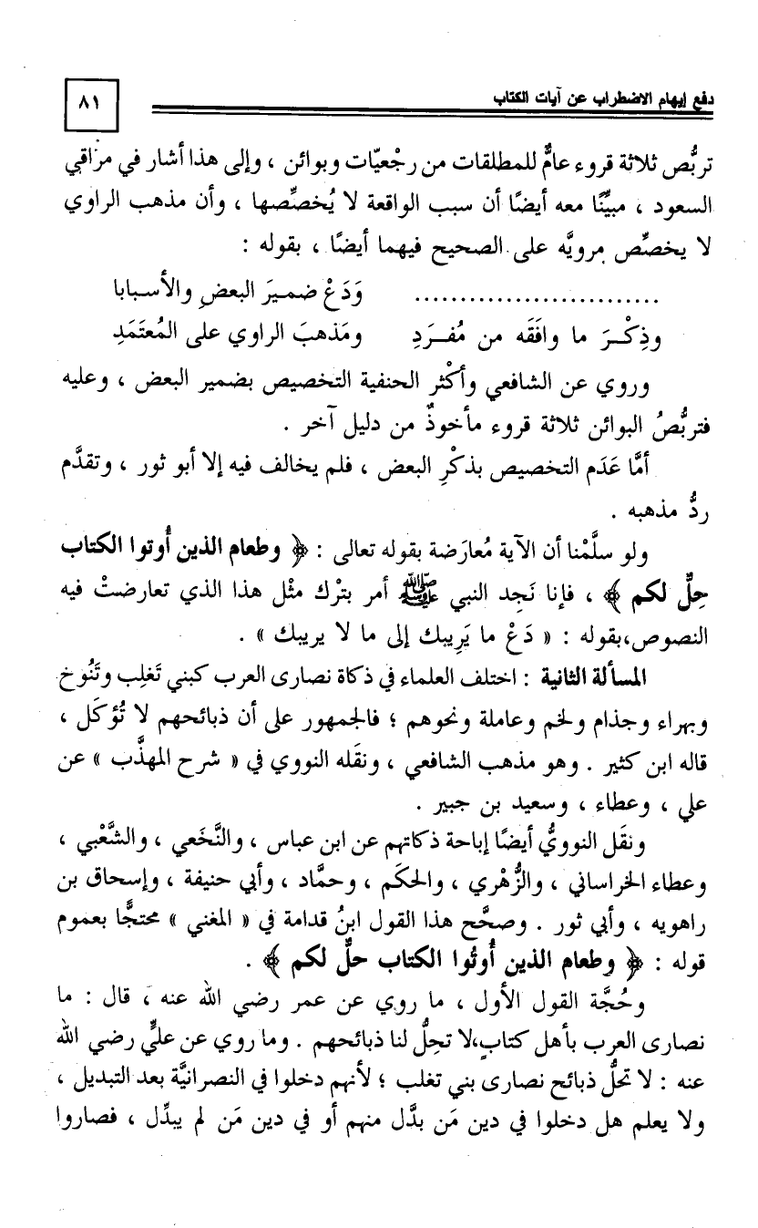 وَلَوْ سَلَّمْنَا أَنَّ الْآيَةَ مُعَارَضَةٌ بِقَوْلِهِ تَعَالَى: وَطَعَامُ الَّذِينَ أُوتُوا الْكِتَابَ حِلٌّ لَكُمْ فَإِنَّا نَجِدُ النَّبِيَّ صَلَّى اللَّهُ عَلَيْهِ وَسَلَّمَ أَمَرَ بِتَرْكِ مِثْلِ هَذَا الَّذِي تَعَارَضَتْ فِيهِ النُّصُوصُ بِقَوْلِهِ: دَعْ مَا يَرِيبُكَ إِلَى مَا لَا يَرِيبُكَ.