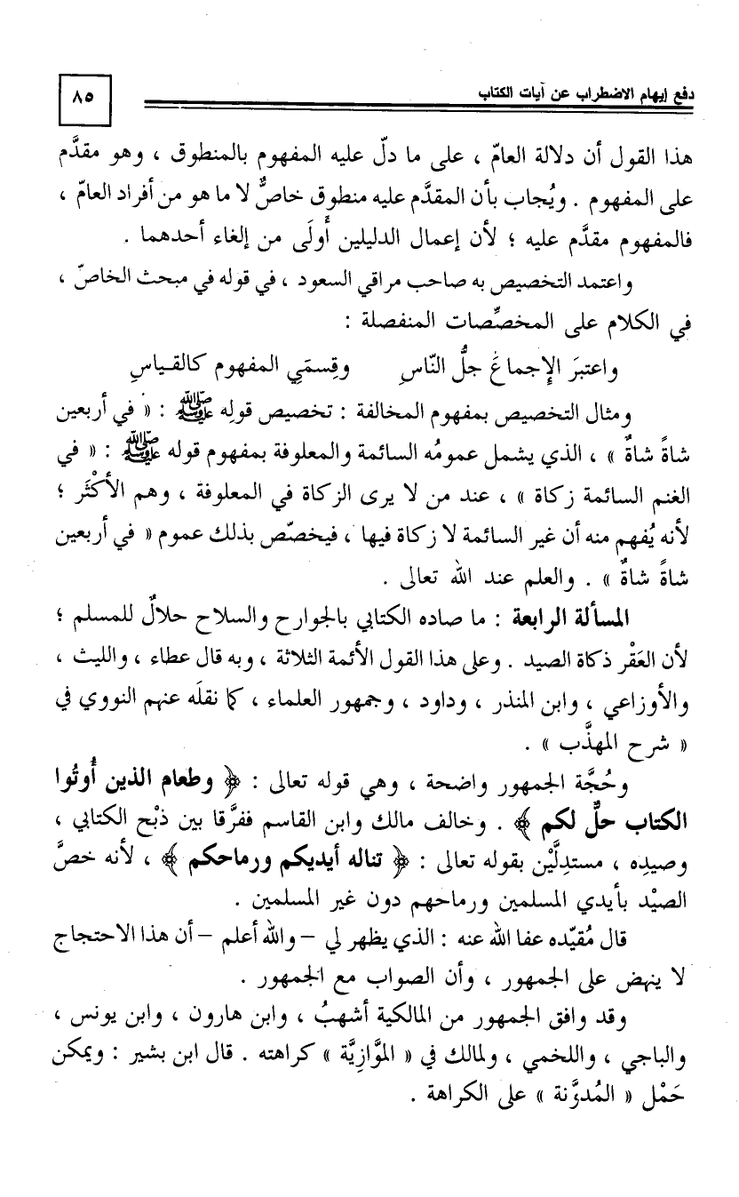 وَحُجَّةُ الْجُمْهُورِ وَاضِحَةٌ وَهِيَ قَوْلُهُ تَعَالَى: وَطَعَامُ الَّذِينَ أُوتُوا الْكِتَابَ حِلٌّ لَكُمْ وَخَالَفَ مَالِكٌ وَابْنُ الْقَاسِمِ فَفَرَّقَا بَيْنَ ذَبْحِ الْكِتَابِيِّ وَصَيْدِهِ مُسْتَدِلِّينَ بِقَوْلِهِ تَعَالَى: تَنَالُهُ أَيْدِيكُمْ وَرِمَاحُكُمْ [5 \ 94] ، لِأَنَّهُ خَصَّ الصَّيْدَ بِأَيْدِي الْمُسْلِمِينَ وَرِمَاحِهِمْ دُونَ غَيْرِ الْمُسْلِمِينَ.