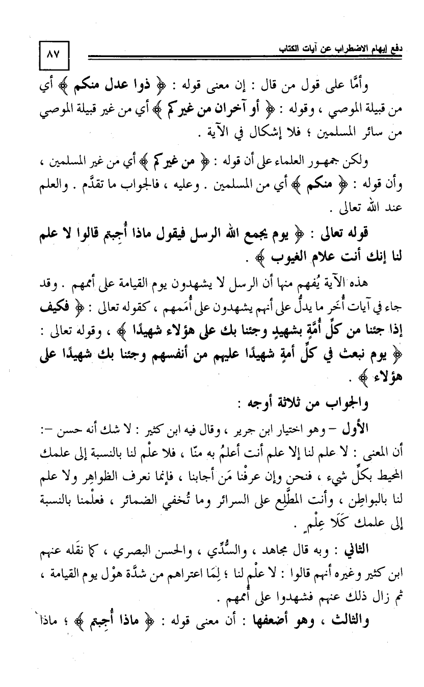 الثَّانِي: وَبِهِ قَالَ مُجَاهِدٌ وَالسُّدِّيُّ وَالْحَسَنُ الْبَصْرِيُّ، كَمَا نَقَلَهُ عَنْهُمُ ابْنُ كَثِيرٍ وَغَيْرُهُ أَنَّهُمْ قَالُوا: لَا عِلْمَ لَنَا لِمَا اعْتَرَاهُمْ مِنْ شِدَّةِ هَوْلِ يَوْمِ الْقِيَامَةِ، ثُمَّ زَالَ ذَلِكَ عَنْهُمْ فَشَهِدُوا عَلَى أُمَمِهِمْ.