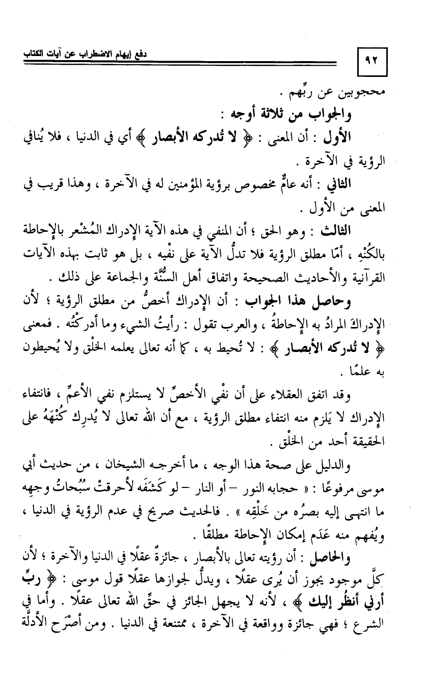 الثَّالِثُ: وَهُوَ الْحَقُّ، أَنَّ الْمَنْفِيَّ فِي هَذِهِ الْآيَةِ الْإِدْرَاكُ الْمُشْعِرُ بِالْإِحَاطَةِ بِالْكُنْهِ، أَمَّا مُطْلَقُ الرُّؤْيَةِ فَلَا تَدُلُّ الْآيَةُ عَلَى نَفْيِهِ بَلْ هُوَ ثَابِتٌ بِهَذِهِ الْآيَاتِ الْقُرْآنِيَّةِ وَالْأَحَادِيثِ الصَّحِيحَةِ وَاتِّفَاقِ أَهْلِ السُّنَّةِ وَالْجَمَاعَةِ عَلَى ذَلِكَ.