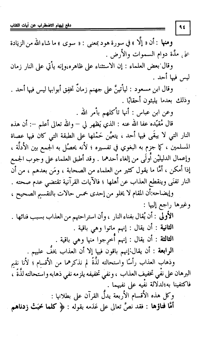 وَقَدْ أَطْبَقَ الْعُلَمَاءُ عَلَى وُجُوبِ الْجَمْعِ إِذَا أَمْكَنَ، أَمَّا مَا يَقُولُهُ كَثِيرٌ مِنَ الْعُلَمَاءِ مِنَ الصَّحَابَةِ، وَمَنْ بَعْدَهُمْ مِنْ أَنَّ النَّارَ تَفْنَى وَيَنْقَطِعُ الْعَذَابُ عَنْ أَهْلِهَا، فَالْآيَاتُ الْقُرْآنِيَّةُ تَقْتَضِي عَدَمَ صِحَّتِهِ، وَإِيضَاحُهُ أَنَّ الْمَقَامَ لَا يَخْلُو مِنْ إِحْدَى خَمْسِ حَالَاتٍ بِالتَّقْسِيمِ الصَّحِيحِ، وَغَيْرُهَا رَاجِعٌ إِلَيْهَا.