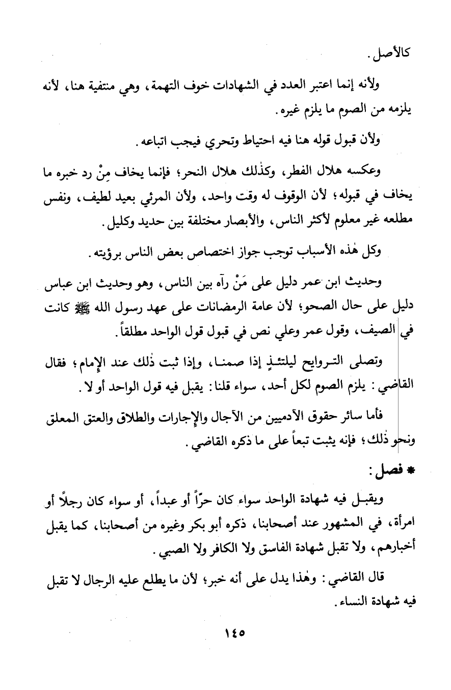 ويقبل فيه شهادة الواحد سواء كان حرّاً أو عبداً, أو سواء كان رجلاً أو امرأة, في المشهور عند أصحابنا, ذكره أبو بكر وغيره من أصحابنا, كما يقبل أخبارهم, ولا تقبل شهادة الفاسق ولا الكافر ولا الصبي.