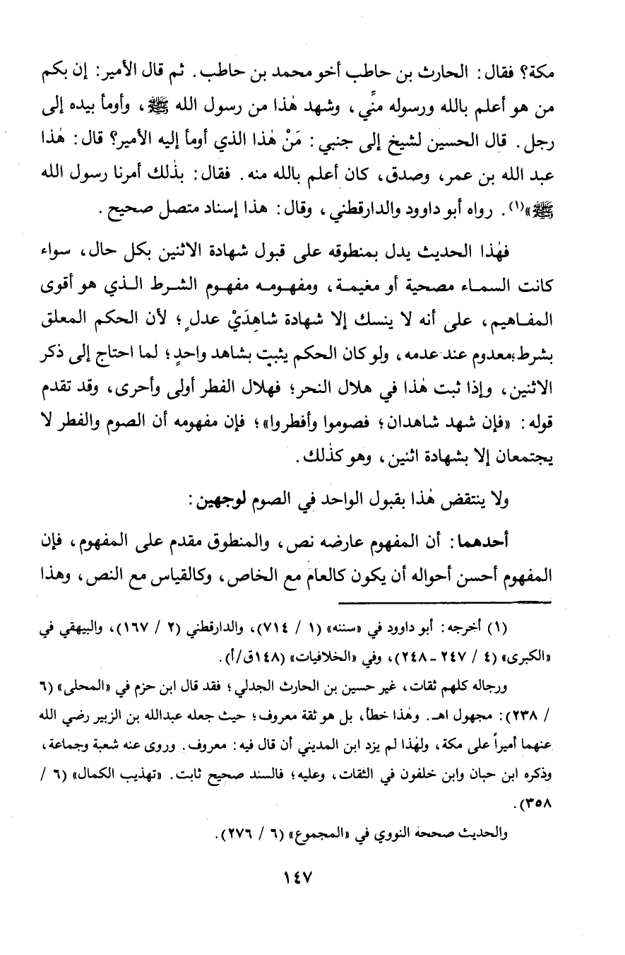 فهذا الحديث يدل بمنطوقه على قبول شهادة الاثنين بكل حال, سواء كانت السماء مصحية أو مغيمة, ومفهومه مفهوم الشرط الذي هو أقوى المفاهيم, على أنه لا ينسك إلا شهادة شاهِدَيْ عدلٍ؛ لأن الحكم المعلق بشرط؛ معدوم عند عدمه, ولو كان الحكم يثبت بشاهد واحدٍ؛ لما احتاج إلى ذكر الاثنين, وإذا ثبت هذا في هلال النحر؛ فهلال الفطر أولى وأحرى, وقد تقدم قوله: «فإن شهد شاهدان؛ فصوموا وأفطروا»؛ فإن مفهومه أن الصوم والفطر لا يجتمعان إلا بشهادة اثنين, وهو كذلك.