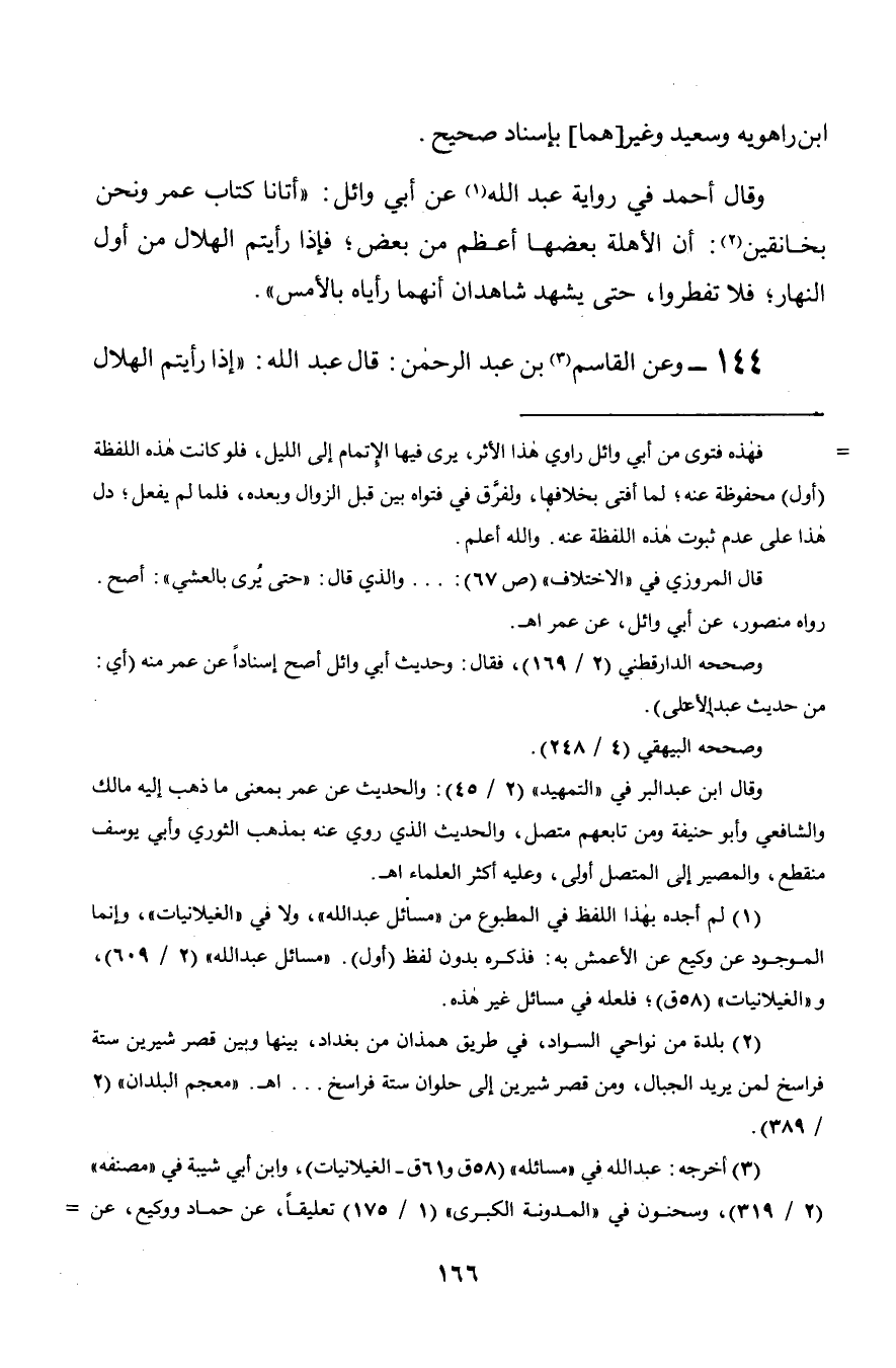 144 - وعن القاسم بن عبد الرحمن: قال عبد الله: «إذا رأيتم الهلال