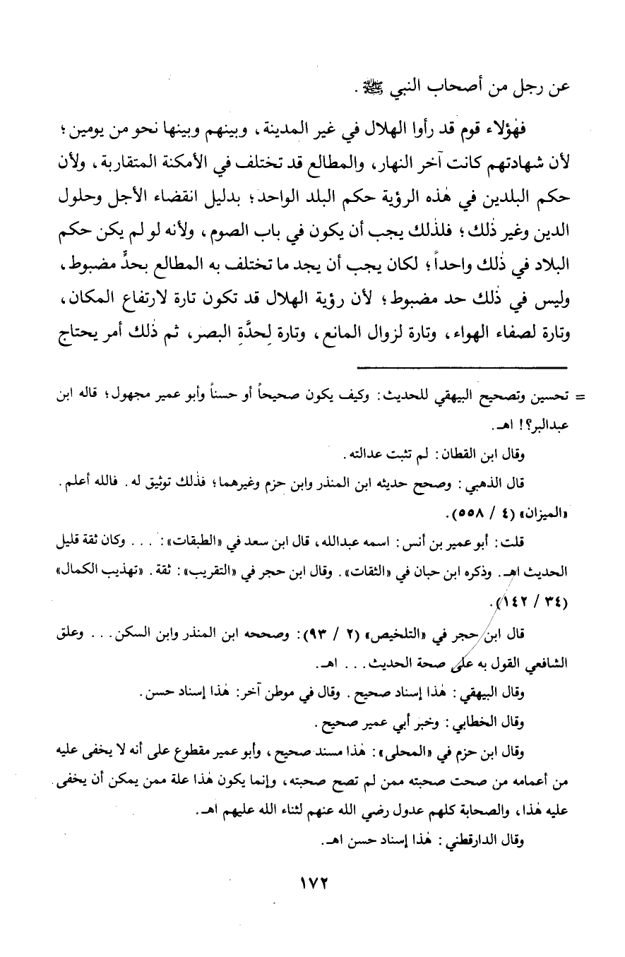 فهؤلاء قوم قد رأوا الهلال في غير المدينة, وبينهم وبينها نحو من يومين؛ لأن شهادتهم كانت آخر النهار, والمطالع قد تختلف في الأمكنة المتقاربة, ولأن حكم البلدين في هذه الرؤية حكم البلد الواحد؛ بدليل انقضاء الأجل وحلول الدين وغير ذلك؛ فلذلك يجب أن يكون في باب الصوم, ولأنه لو لم يكن حكم البلاد في ذلك واحداً؛ لكان يجب أن يجد ما تختلف به المطالع بحدٍّ مضبوط, وليس في ذلك حد مضبوط؛ لأن رؤية الهلال قد تكون تارة لارتفاع المكان, وتارة لصفاء الهواء, وتارة لزوال المانع, وتارة لِحدَّةِ البصر, ثم ذلك أمر يحتاج