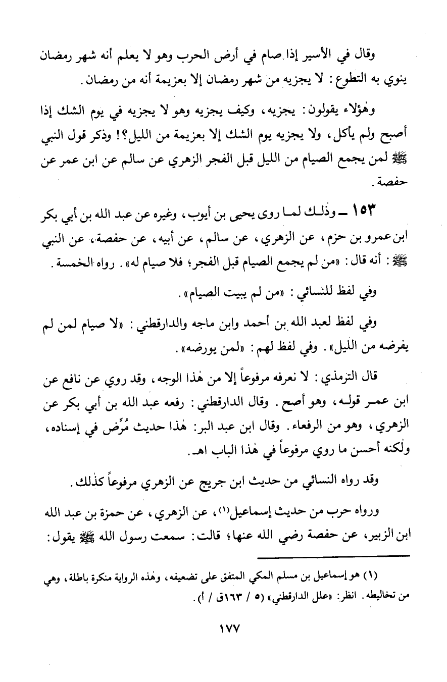 153 - وذلك لما روى يحيى بن أيوب, وغيره عن عبد الله بن أبي بكر ابن عمرو بن حزم, عن الزهري, عن سالم, عن أبيه, عن حفصة, عن النبي صلى الله عليه وسلم: أنه قال: «من لم يجمع الصيام قبل الفجر؛ فلا صيام له». رواه الخمسة.